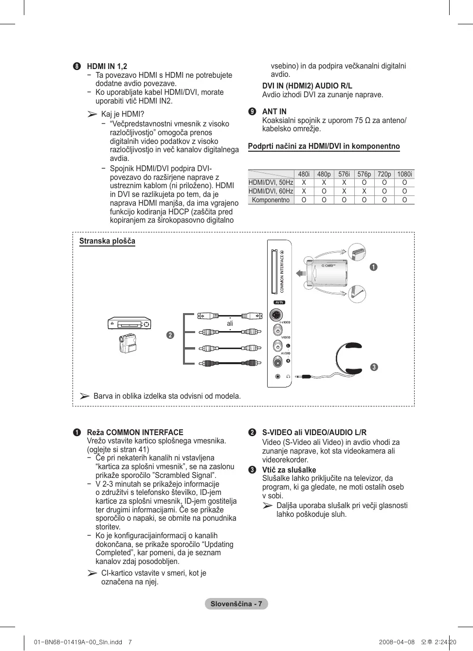 Na voljo je le TV- ali DTV-izhod. Izhod lahko izberete. se nadaljuje … Slovenščina - 01-BN68-01419A-00_Sln.indd 6 2008-04-08 오후 2:24:17 8 HDMI IN 1,2 − Ta povezavo HDMI s HDMI ne potrebujete dodatne avdio povezave. − Ko uporabljate kabel HDMI/DVI, morate uporabiti vtič HDMI IN2. ➢ Kaj je HDMI? − “Večpredstavnostni vmesnik z visoko razločljivostjo” omogoča prenos digitalnih video podatkov z visoko razločljivostjo in več kanalov digitalnega avdia. − Spojnik HDMI/DVI podpira DVIpovezavo do razširjene naprave z ustreznim kablom (ni priloženo). HDMI in DVI se razlikujeta po tem, da je naprava HDMI manjša, da ima vgrajeno funkcijo kodiranja HDCP (zaščita pred kopiranjem za širokopasovno digitalno vsebino) in da podpira večkanalni digitalni avdio.