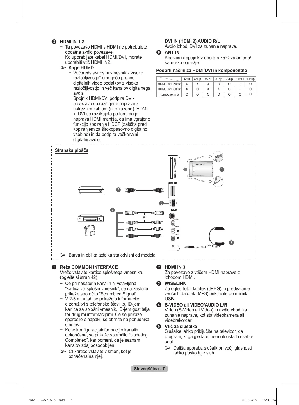 Avdio izhodi DVI za zunanje naprave. 9 ANT IN Koaksialni spojnik z uporom 75 Ω za anteno/ kabelsko omrežje. Podprti načini za HDMI/DVI in komponentno HDMI/DVI, 50Hz HDMI/DVI, 60Hz Komponentno 480i