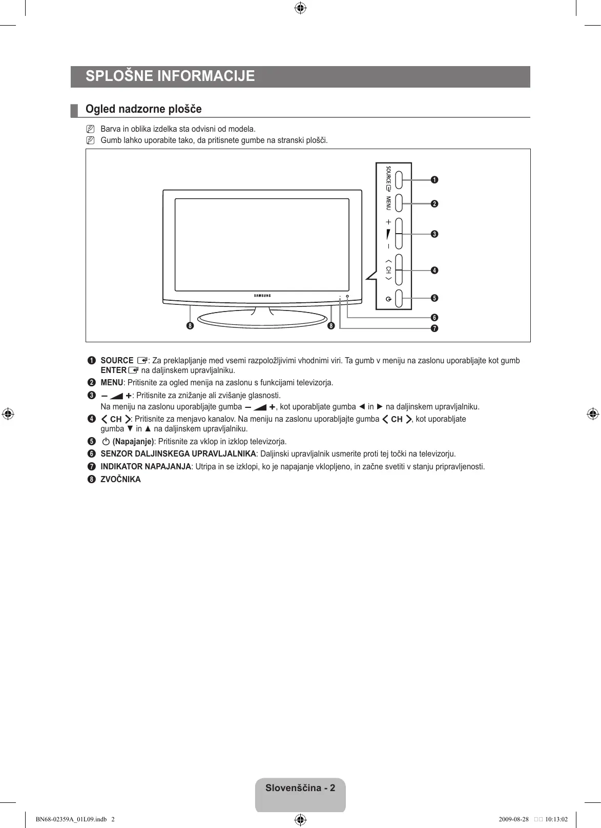 ❑ Varnostni ukrepi pri prikazu mirujoče slike Mirujoča slika lahko trajno poškoduje televizijski zaslon ● Mirujoče in delno mirujoče slike ne prikazujte na zaslonu LCD dlje kot 2 uri, saj lahko povzroči zadrževanje slike na zaslonu. Tako zadrževanje slike se imenuje tudi “ožig zaslona”. Da bi se izognili takemu zadrževanju slike, pri prikazovanju mirujoče slike zmanjšajte stopnjo svetlosti in kontrasta zaslona. Dolgotrajno gledanje slike z razmerjem stranic 4:3 na televizorju LCD lahko na levi in desni strani ter na sredini zaslona povzroči sledi okvirja zaradi različnega svetlobnega oddajanja na zaslonu. Predvajanje DVDja ali uporaba igralne konzole ima lahko podobne učinke. Garancija ne vključuje poškodb, ki so nastale na tak način. ● Če je na zaslonu dlje časa prikazana mirujoča računalniška slika ali slika iz video igrice, to lahko povzroči delni prikaz zakasnele slike. Ta učinek preprečite tako, da pri prikazovanju mirujočih slih zmanjšate svetlost in kontrast. © 2009 Samsung Electronics Co., Ltd. All rights reserved. BN68-02359A_01L09.indb 1 2009-08-28 10:13:01 Vsebina