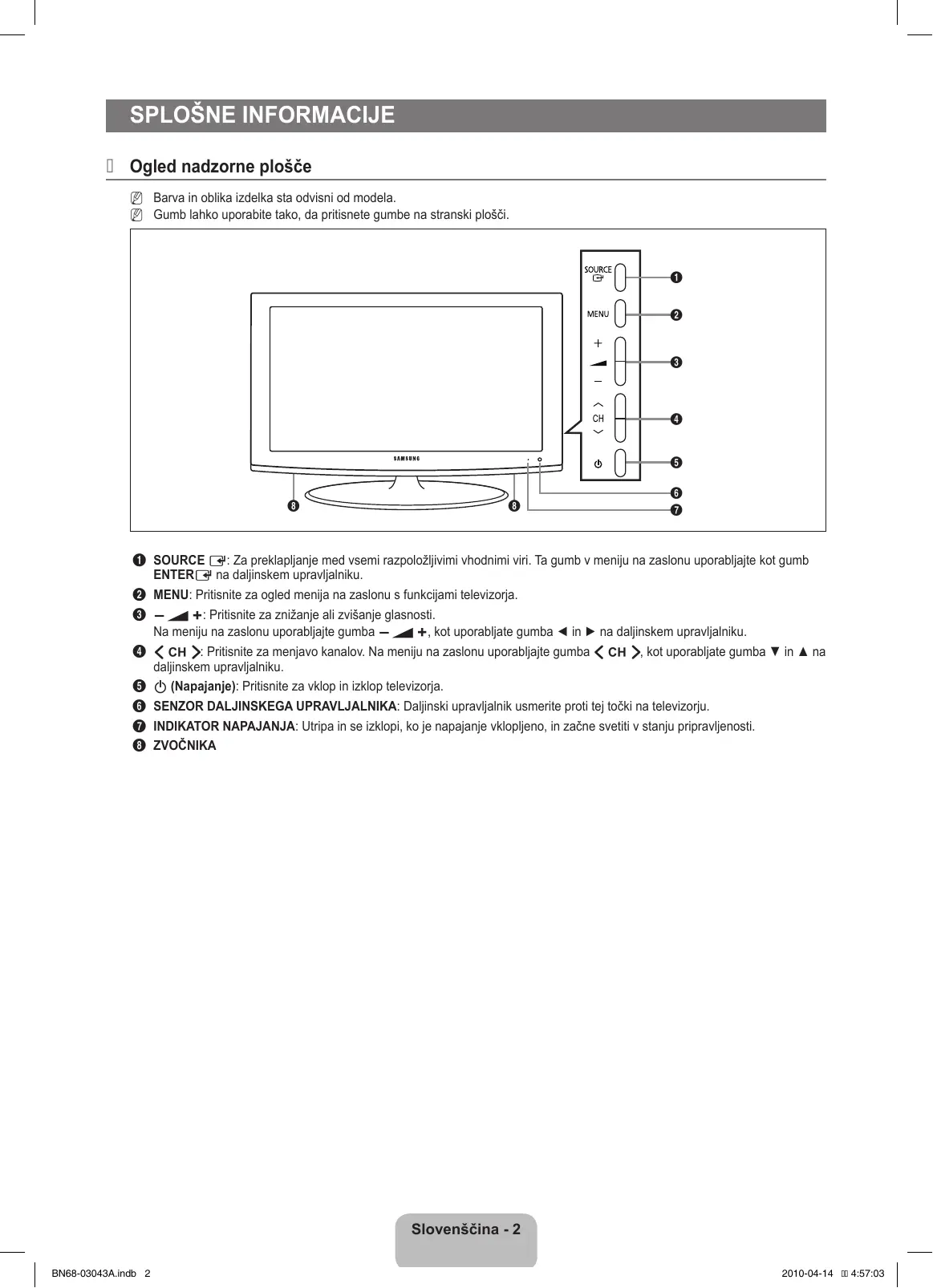 ¦¦ Ogled nadzorne plošče NN Barva in oblika izdelka sta odvisni od modela. NN Gumb lahko uporabite tako, da pritisnete gumbe na stranski plošči.