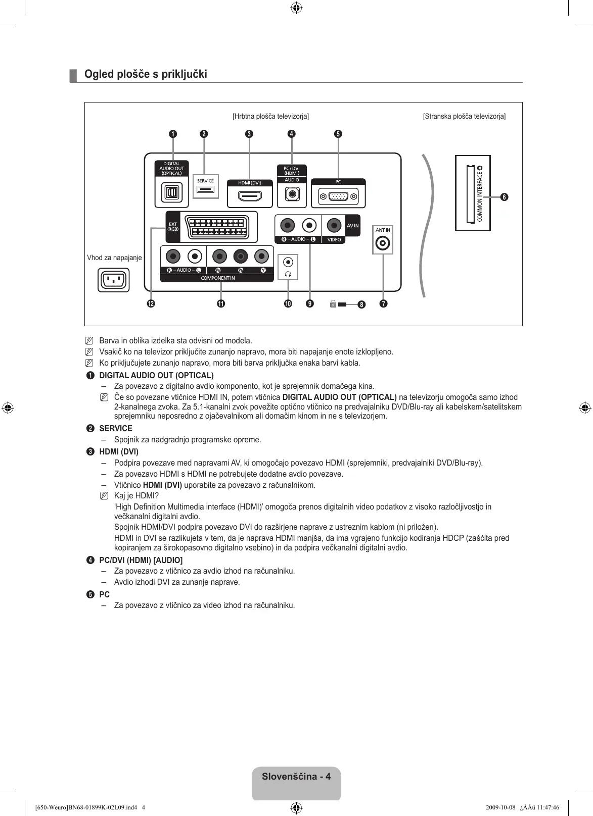 Barva in oblika izdelka sta odvisni od modela. Vsakič ko na televizor priključite zunanjo napravo, mora biti napajanje enote izklopljeno. Ko priključujete zunanjo napravo, mora biti barva priključka enaka barvi kabla. DIGITAL AUDIO OUT (OPTICAL) – Za povezavo z digitalno avdio komponento, kot je sprejemnik domačega kina. N Če so povezane vtičnice HDMI IN, potem vtičnica DIGITAL AUDIO OUT (OPTICAL) na televizorju omogoča samo izhod 2-kanalnega zvoka. Za 5.1-kanalni zvok povežite optično vtičnico na predvajalniku DVD/Blu-ray ali kabelskem/satelitskem sprejemniku neposredno z ojačevalnikom ali domačim kinom in ne s televizorjem. SERVICE – Spojnik za nadgradnjo programske opreme. HDMI (DVI) – Podpira povezave med napravami AV, ki omogočajo povezavo HDMI (sprejemniki, predvajalniki DVD/Blu-ray). – Za povezavo HDMI s HDMI ne potrebujete dodatne avdio povezave. – Vtičnico HDMI (DVI) uporabite za povezavo z računalnikom. N Kaj je HDMI? ‘High Definition Multimedia interface (HDMI)’ omogoča prenos digitalnih video podatkov z visoko razločljivostjo in večkanalni digitalni avdio. Spojnik HDMI/DVI podpira povezavo DVI do razširjene naprave z ustreznim kablom (ni priložen). HDMI in DVI se razlikujeta v tem, da je naprava HDMI manjša, da ima vgrajeno funkcijo kodiranja HDCP (zaščita pred kopiranjem za širokopasovno digitalno vsebino) in da podpira večkanalni digitalni avdio.