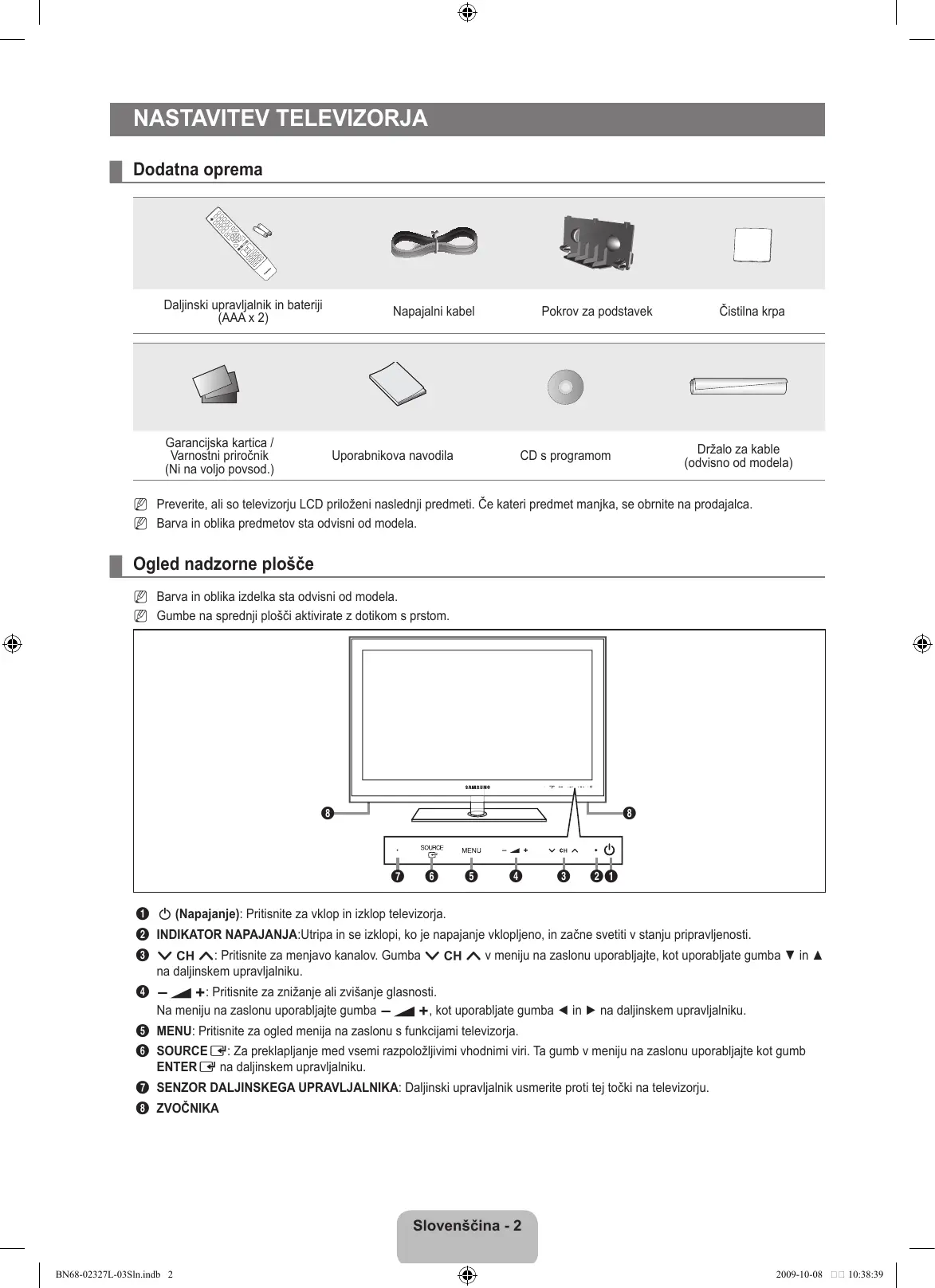 Spojnik za nadgradnje programske opreme, način predvajanja predstavnosti itd. S Samsungovim omrežjem se lahko povežete brezžično s ‘Samsungovo kartico za brezžični LAN’ (na prodaj posebej). N Za trdi disk USB uporabite vrata USB 1 (HDD). $ Reža COMMON INTERFACE Če ni vstavljena ‘kartica za splošni vmesnik (CI+)’, se pri nekaterih kanalih na zaslonu prikaže sporočilo ‘Scrambled Signal’. V 2–3 minutah se prikažejo informacije o združitvi s telefonsko številko, ID-jem ‘kartice za splošni vmesnik (CI+)’, ID-jem gostitelja in druge informacije. Če se prikaže sporočilo o napaki, se obrnite na ponudnika storitev. Ko je konfiguracija informacij o kanalih končana, se prikaže sporočilo ‘Updating Completed’, kar pomeni, da je seznam kanalov posodobljen. Pri nekaterih modelih se ob vstavitvi kartice za splošni vmesnik prikaže poziv za geslo za Parental Lock. Pri nekaterih modelih se pri programih za odrasle (18 let in več) poziv za geslo prikaže tudi, če je možnost Parental Lock nastavljena na Allow All. N ‘Kartico za splošni vmesnik (CI+)’ dobite pri lokalnem ponudniku kabelske televizije. ‘Kartico za splošni vmesnik (CI+)’ odstranite tako, da jo previdno izvlečete z rokami, saj se pri padcu lahko poškoduje. N ‘Kartico za splošni vmesnik (CI+)’ vstavite v smeri, ki je označena na njej. N Kje se nahaja reža COMMON INTERFACE, je odvisno od modela. N Kartica za splošni vmesnik (CI+) ni podprta v nekaterih državah, regijah in pri nekaterih oddajnih postajah. Preverite pri pooblaščenem prodajalcu. N Funkcija CI+ je na voljo samo pri modelu LE********P. N Če ste naleteli na težave, se obrnite na ponudnika storitev. Slovenščina - BN68-02327L-03Sln.indb 4 2009-10-08 10:38:40 ¦ Ogled daljinskega upravljalnika N Daljinski upravljalnik lahko uporabljate do oddaljenosti približno 7 m od televizorja. N Na delovanje daljinskega upravljalnika lahko vpliva močna svetloba. N Barva in oblika izdelka sta odvisni od modela. 1 POWER: Za vklop in izklop televizorja. ^ MENU: za prikaz glavnega menija na zaslonu. 2 TV: Za neposredno izbiro načina televizorja. & GUIDE: Prikaz elektronskega programskega vodnika (EPG) 3 ŠTEVILSKI GUMBI : Pritisnite za menjavo kanala.