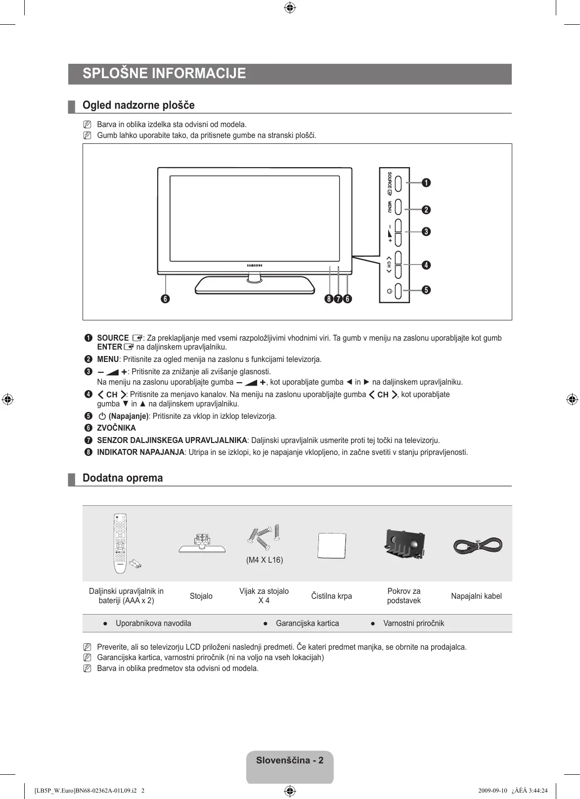 Vsebina Številka izbrane strani. Identiteta televizijskega kanala. Številka trenutne strani ali indikatorji iskanja. Datum in čas. Besedilo. Informacije o stanju. Informacije FASTEXT. Slovenščina - 28 [LB5P_W.Euro]BN68-02362A-01L09.i28 28 2009-09-10 ¿ÀÈÄ 3:44:30 N Informacije teleteksta so pogosto razdeljene na več zaporednih strani, do katerih imate dostop z: – Vnosom številke strani – Izbiro naslova na seznamu – Izbiro obarvanega naslova (sistem FASTEXT) N Televizor podira različico teleteksta 2.5, v kateri je mogoče prikazati dodatne grafike ali besedilo. N Teletekst je lahko prikazan s praznimi deli strani, odvisno od prenosa. N V teh primerih dodatne grafike ali besedilo ni oddajano. N Starejši televizorji, ki ne podpirajo različice 2.5, ne morejo prikazati dodatnih grafik ali besedila, ne glede na to, ali se le-to oddaja. O Pritisnite gumb TV za izhod iz teleteksta. N Pri teletekstu z razmerjem stranic 16:9 je prikazana slika z razmerjem stranic 16:9 ¦ Namestitev stojala N Prednastavitev: Na stojalo namestite vodilo stojala in ovoj in ga privijte z vijaki. Velja samo za 32-palčne modele. Zadaj Spredaj
