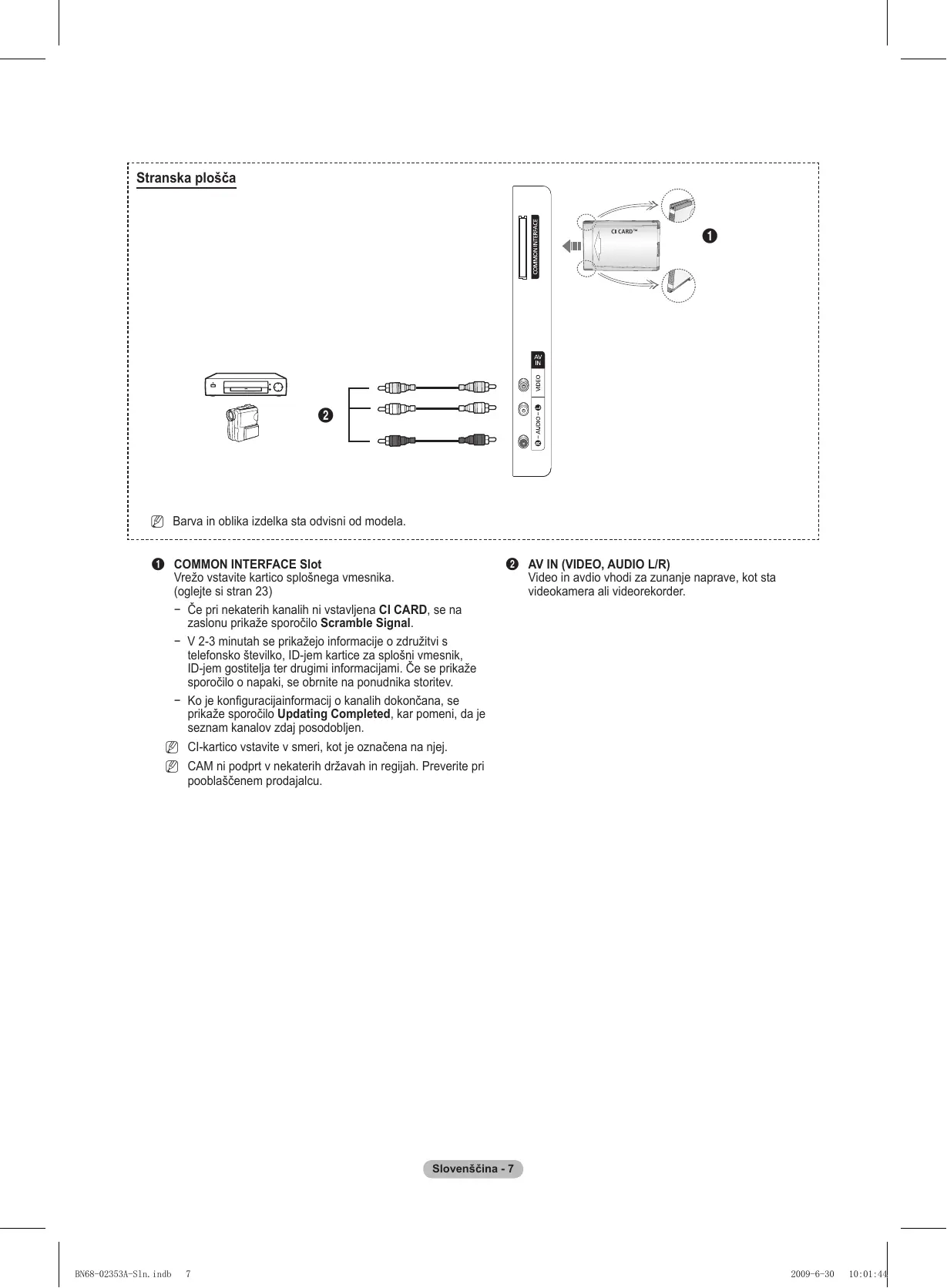 N Barva in oblika izdelka sta odvisni od modela. 1 COMMON INTERFACE Slot Vrežo vstavite kartico splošnega vmesnika. (oglejte si stran 23) − Če pri nekaterih kanalih ni vstavljena CI CARD, se na zaslonu prikaže sporočilo Scramble Signal. − V 2-3 minutah se prikažejo informacije o združitvi s telefonsko številko, ID-jem kartice za splošni vmesnik, ID-jem gostitelja ter drugimi informacijami. Če se prikaže sporočilo o napaki, se obrnite na ponudnika storitev. − Ko je konfiguracijainformacij o kanalih dokončana, se prikaže sporočilo Updating Completed, kar pomeni, da je seznam kanalov zdaj posodobljen. 2 AV IN (VIDEO, AUDIO L/R) Video in avdio vhodi za zunanje naprave, kot sta videokamera ali videorekorder. N CI-kartico vstavite v smeri, kot je označena na njej. N CAM ni podprt v nekaterih državah in regijah. Preverite pri pooblaščenem prodajalcu. Slovenščina - BN68-02353A-Sln.indb