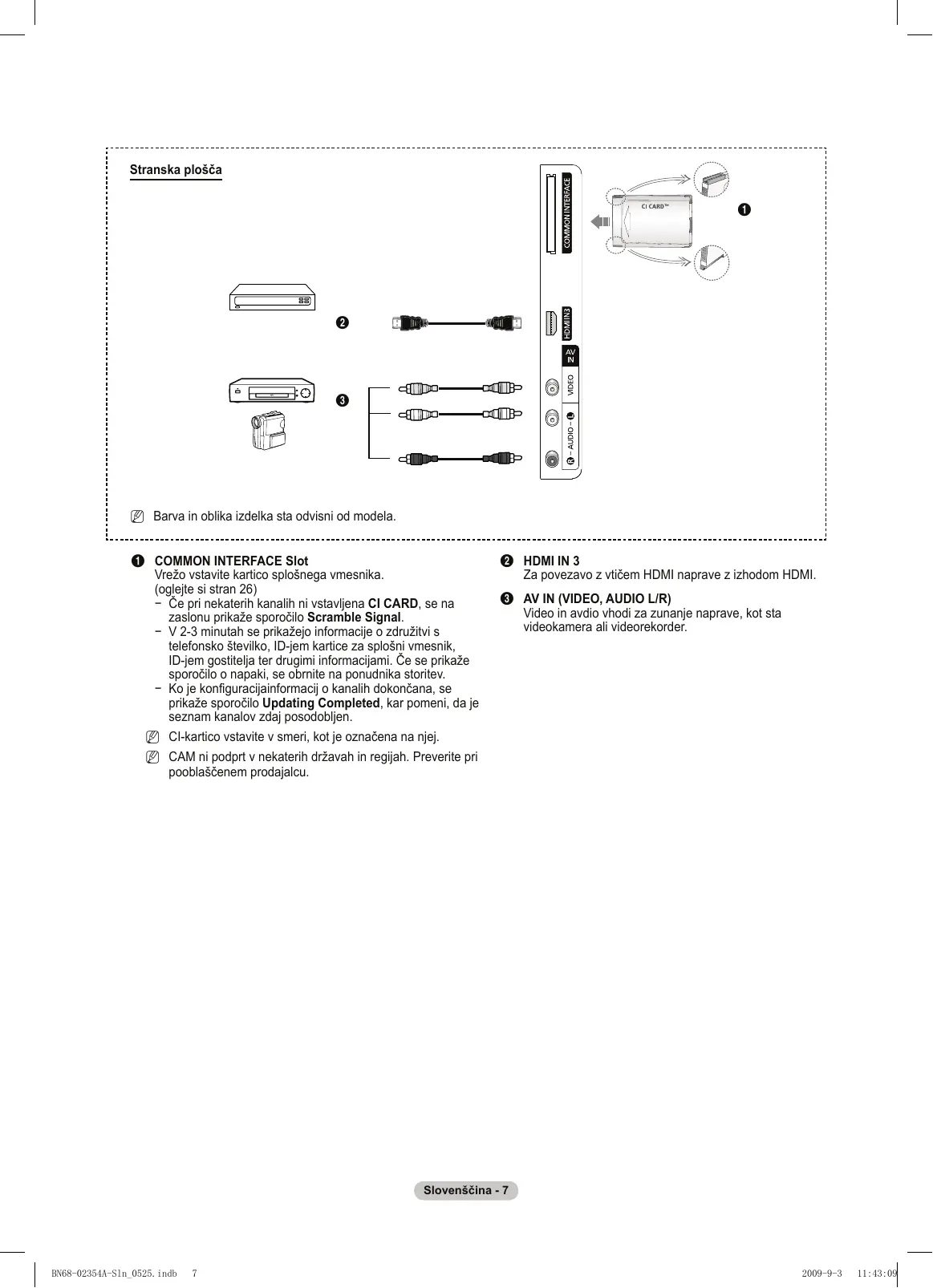 N Barva in oblika izdelka sta odvisni od modela. 1 COMMON INTERFACE Slot Vrežo vstavite kartico splošnega vmesnika. (oglejte si stran 26) − Če pri nekaterih kanalih ni vstavljena CI CARD, se na zaslonu prikaže sporočilo Scramble Signal. − V 2-3 minutah se prikažejo informacije o združitvi s telefonsko številko, ID-jem kartice za splošni vmesnik, ID-jem gostitelja ter drugimi informacijami. Če se prikaže sporočilo o napaki, se obrnite na ponudnika storitev. − Ko je konfiguracijainformacij o kanalih dokončana, se prikaže sporočilo Updating Completed, kar pomeni, da je seznam kanalov zdaj posodobljen. 2 HDMI IN 3 Za povezavo z vtičem HDMI naprave z izhodom HDMI. 3 AV IN (VIDEO, AUDIO L/R) Video in avdio vhodi za zunanje naprave, kot sta videokamera ali videorekorder. N CI-kartico vstavite v smeri, kot je označena na njej. N CAM ni podprt v nekaterih državah in regijah. Preverite pri pooblaščenem prodajalcu. Slovenščina - BN68-02354A-Sln_0525.indb