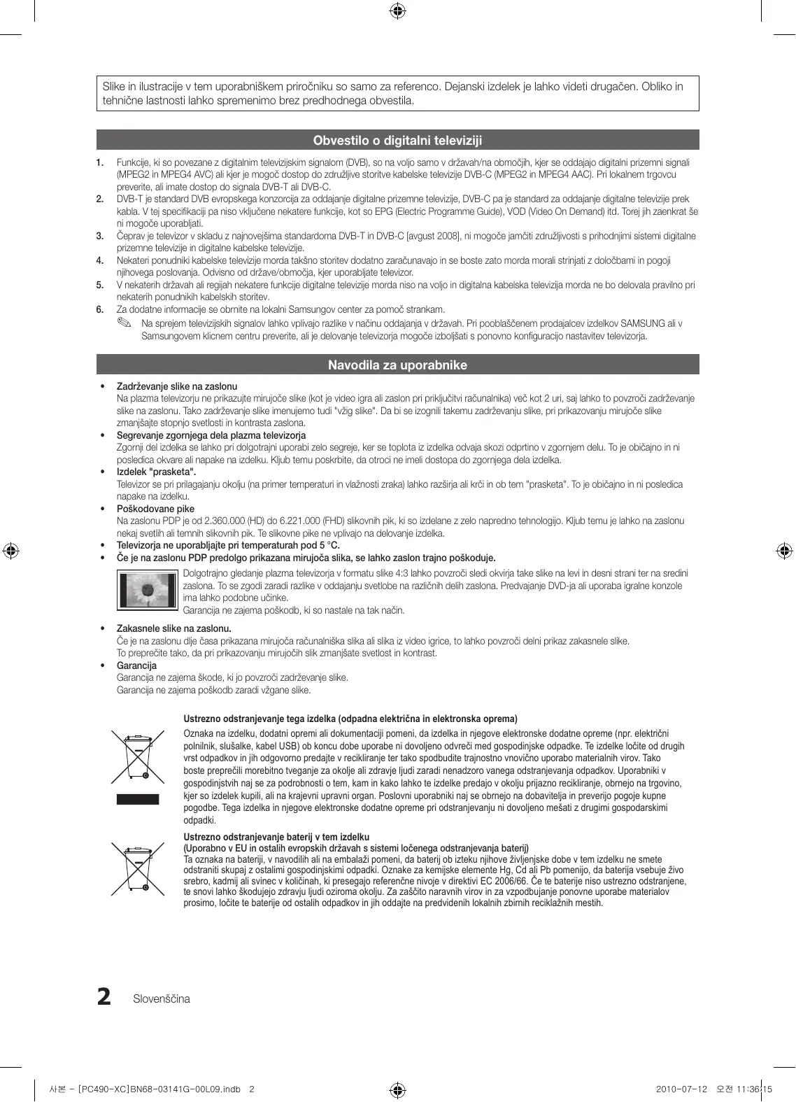 Zadrževanje slike na zaslonu Na plazma televizorju ne prikazujte mirujoče slike (kot je video igra ali zaslon pri priključitvi računalnika) več kot 2 uri, saj lahko to povzroči zadrževanje slike na zaslonu. Tako zadrževanje slike imenujemo tudi "vžig slike". Da bi se izognili takemu zadrževanju slike, pri prikazovanju mirujoče slike zmanjšajte stopnjo svetlosti in kontrasta zaslona. Segrevanje zgornjega dela plazma televizorja Zgornji del izdelka se lahko pri dolgotrajni uporabi zelo segreje, ker se toplota iz izdelka odvaja skozi odprtino v zgornjem delu. To je običajno in ni posledica okvare ali napake na izdelku. Kljub temu poskrbite, da otroci ne imeli dostopa do zgornjega dela izdelka. Izdelek "prasketa". Televizor se pri prilagajanju okolju (na primer temperaturi in vlažnosti zraka) lahko razširja ali krči in ob tem "prasketa". To je običajno in ni posledica napake na izdelku. Poškodovane pike Na zaslonu PDP je od 2.360.000 (HD) do 6.221.000 (FHD) slikovnih pik, ki so izdelane z zelo napredno tehnologijo. Kljub temu je lahko na zaslonu nekaj svetlih ali temnih slikovnih pik. Te slikovne pike ne vplivajo na delovanje izdelka. Televizorja ne uporabljajte pri temperaturah pod 5 °C. Če je na zaslonu PDP predolgo prikazana mirujoča slika, se lahko zaslon trajno poškoduje. Dolgotrajno gledanje plazma televizorja v formatu slike 4:3 lahko povzroči sledi okvirja take slike na levi in desni strani ter na sredini zaslona. To se zgodi zaradi razlike v oddajanju svetlobe na različnih delih zaslona. Predvajanje DVD-ja ali uporaba igralne konzole ima lahko podobne učinke. Garancija ne zajema poškodb, ki so nastale na tak način.