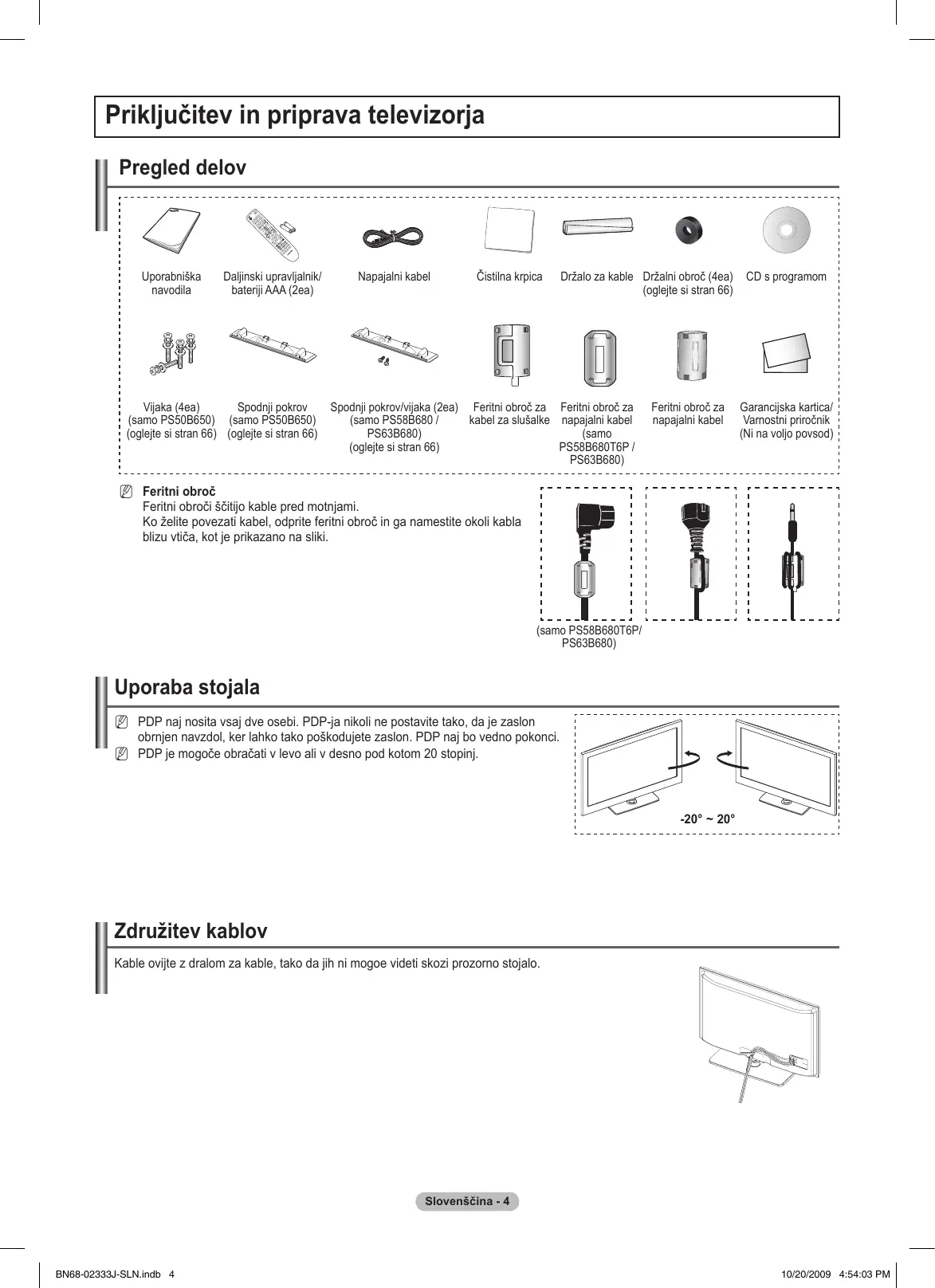Opomba Gumb na dotik TOOLS Slovenščina - 3 BN68-02333J-SLN.indb 3 10/20/2009 4:54:00 PM Priključitev in priprava televizorja Pregled delov Uporabniška navodila Daljinski upravljalnik/ bateriji AAA (2ea) Vijaka (4ea) Spodnji pokrov (samo PS50B650) (samo PS50B650) (oglejte si stran 66) (oglejte si stran 66) Napajalni kabel Čistilna krpica Držalo za kable Držalni obroč (4ea) (oglejte si stran 66) Spodnji pokrov/vijaka (2ea) Feritni obroč za Feritni obroč za (samo PS58B680 / kabel za slušalke napajalni kabel PS63B680) (samo (oglejte si stran 66) PS58B680T6P / PS63B680) Feritni obroč za napajalni kabel CD s programom Garancijska kartica/ Varnostni priročnik (Ni na voljo povsod) NN Feritni obroč Feritni obroči ščitijo kable pred motnjami. Ko želite povezati kabel, odprite feritni obroč in ga namestite okoli kabla blizu vtiča, kot je prikazano na sliki. (samo PS58B680T6P/ PS63B680) Uporaba stojala NN PDP naj nosita vsaj dve osebi. PDP-ja nikoli ne postavite tako, da je zaslon obrnjen navzdol, ker lahko tako poškodujete zaslon. PDP naj bo vedno pokonci. NN PDP je mogoče obračati v levo ali v desno pod kotom 20 stopinj. -20° ~ 20° Združitev kablov Kable ovijte z dralom za kable, tako da jih ni mogoe videti skozi prozorno stojalo. Slovenščina - 4 BN68-02333J-SLN.indb 4 10/20/2009 4:54:03 PM Ogled nadzorne plošče (PS50B650) (PS58B680 / PS63B680) Gumbi na sprednji plošči. Za upravljanje se dotaknite posameznega gumba. NN Barva in oblika izdelka sta odvisni od modela. 1 SOURCE Za preklapljanje med vsemi razpololjivimi vhodnimi viri (TV, Ext1, Ext2, AV, Component, PC, HDMI1, HDMI2/DVI, HDMI3, HDMI4, USB). NN Na meniju na zaslonu ta gumb uporabljajte kot gumb 5 INDIKATOR NAPAJANJA Utripa in se izklopi, ko je napajanje vklopljeno, in začne svetiti v stanju pripravljenosti.