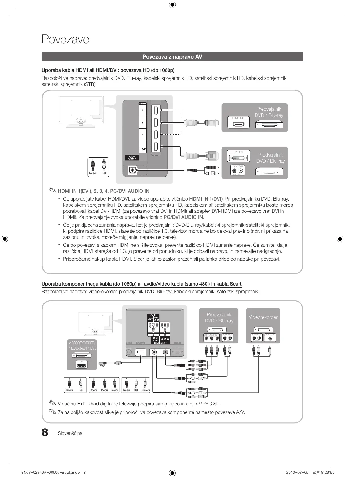 R-AUDIO-L ✎✎HDMI IN 1(DVI), 2, 3, 4, PC/DVI AUDIO IN xx Če uporabljate kabel HDMI/DVI, za video uporabite vtičnico HDMI IN 1(DVI). Pri predvajalniku DVD, Blu-ray, kabelskem sprejemniku HD, satelitskem sprejemniku HD, kabelskem ali satelitskem sprejemniku boste morda potrebovali kabel DVI-HDMI (za povezavo vrat DVI in HDMI) ali adapter DVI-HDMI (za povezavo vrat DVI in HDMI). Za predvajanje zvoka uporabite vtičnico PC/DVI AUDIO IN. xx Če je priključena zunanja naprava, kot je predvajalnik DVD/Blu-ray/kabelski sprejemnik/satelitski sprejemnik, ki podpira različice HDMI, starejše od različice 1,3, televizor morda ne bo deloval pravilno (npr. ni prikaza na zaslonu, ni zvoka, moteče migljanje, nepravilne barve). xx Če po povezavi s kablom HDMI ne slišite zvoka, preverite različico HDMI zunanje naprave. Če sumite, da je različica HDMI starejša od 1,3, jo preverite pri ponudniku, ki je dobavil napravo, in zahtevajte nadgradnjo. xx Priporočamo nakup kabla HDMI. Sicer je lahko zaslon prazen ali pa lahko pride do napake pri povezavi. Uporaba komponentnega kabla (do 1080p) ali avdio/video kabla (samo 480i) in kabla Scart Razpoložljive naprave: videorekorder, predvajalnik DVD, Blu-ray, kabelski sprejemnik, satelitski sprejemnik Predvajalnik DVD / Blu-ray AUDIO OUT AUDIO OUT