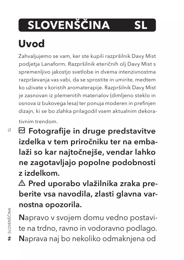 broken_image Fotografije in druge predstavitve izdelka v tem priročniku ter na embalaži so kar najtočnejše, vendar lahko ne zagotavljajo popolne podobnosti z izdelkom. warning_amber Pred uporabo vlažilnika zraka preberite vsa navodila, zlasti glavna varnostna opozorila. Napravo v svojem domu vedno postavite na trdno, ravno in vodoravno podlago. Naprava naj bo nekoliko odmaknjena od