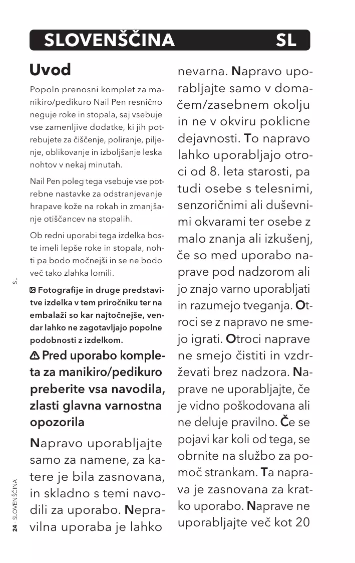 For genuine hand and foot care, the be dangerous. The decomplete and portable Nail Pen vice should only be used manicure/pedicure set has all the in a home/private enviinterchangeable attachments you need to clean, polish, file, shape and ronment and not in a shine your nails in just a few minutes. professional setting. This In addition, the Nail Pen includes device can be used by special attachments for removing children from 8 years of rough skin from your hands and reducing calluses on your feet. age as well as by people EN