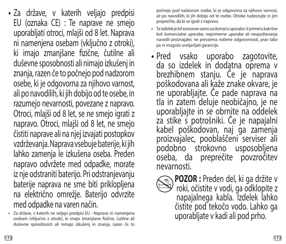 M ISE EN GARDE : Enlever la partie tenue à la main du cable d'alimentation avant de la nettoyer sous l'eau. Convient pour le nettoyage sous un robinet d'eau ouvert. Peut être utilisé dans le bain ou sous la douche. • Ne jamais mettre l'appareil au lave-vaisselle. Ne pas nettoyer le produit avec des produits corrosifs • Ne pas utiliserl'appareil par température inférieure à 15 °C et supérieure à 35 °C. Toujours conserver l'appareil sur une surface plane, résistante à la chaleur. Ne jamais mettre l'appareil en contact avec d'autres produits inflammables. Aussi si l'appareil devient très chaud lors de son utilisation, éviter tout contact avec la peau. • Pour éviter des echauffements de la peau il est conseillé d'utiliser l'appareil lentement et sans effort. •