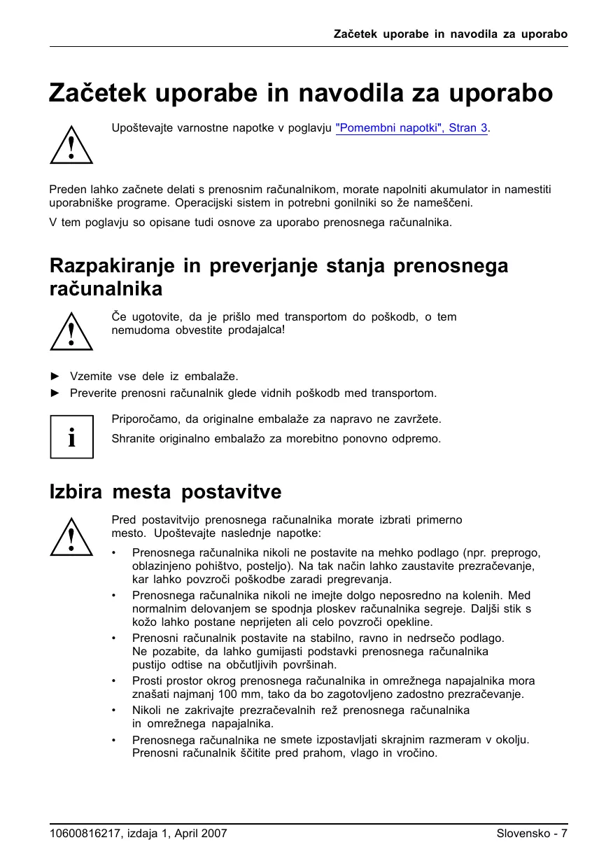 Razpakiranje in preverjanje stanja prenosnega računalnika Če ugotovite, da je prišlo med transportom do poškodb, o tem nemudoma obvestite prodajalca!