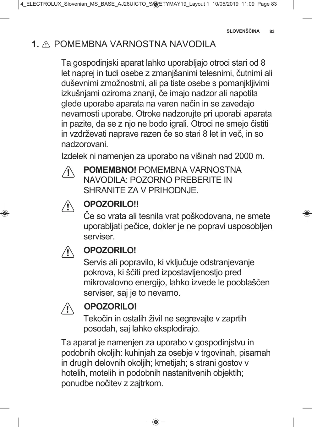 Pomembna varnostna navodila ta gospodinjski aparat lahko uporabljajo otroci stari od 8 let naprej in tudi osebe z zmanjšanimi telesnimi, čutnimi ali duševnimi zmožnostmi, ali pa tiste osebe s pomanjkljivimi izkušnjami oziroma znanji, če imajo nadzor ali napotila glede uporabe aparata na varen način in se zavedajo nevarnosti uporabe. otroke nadzorujte pri uporabi aparata in pazite, da se z njo ne bodo igrali. otroci ne smejo čistiti in vzdrževati naprave razen če so stari 8 let in več, in so nadzorovani. izdelek ni namenjen za uporabo na višinah nad 2000 m. POMEMBNO! Pomembna varnostna navodila: PoZorno Preberite in sHranite Za v PriHodnJe. OPOZORILO!! če so vrata ali tesnila vrat poškodovana, ne smete uporabljati pečice, dokler je ne popravi usposobljen serviser. OPOZORILO! servis ali popravilo, ki vključuje odstranjevanje pokrova, ki ščiti pred izpostavljenostjo pred mikrovalovno energijo, lahko izvede le pooblaščen serviser, saj je to nevarno. OPOZORILO! tekočin in ostalih živil ne segrevajte v zaprtih posodah, saj lahko eksplodirajo. ta aparat je namenjen za uporabo v gospodinjstvu in podobnih okoljih: kuhinjah za osebje v trgovinah, pisarnah in drugih delovnih okoljih; kmetijah; s strani gostov v hotelih, motelih in podobnih nastanitvenih objektih; ponudbe nočitev z zajtrkom. 4_ELECTROLUX_Slovenian_MS_BASE_AJ26UICTO_SAFETYMAY19_Layout 1 10/05/2019 11:09 Page 84