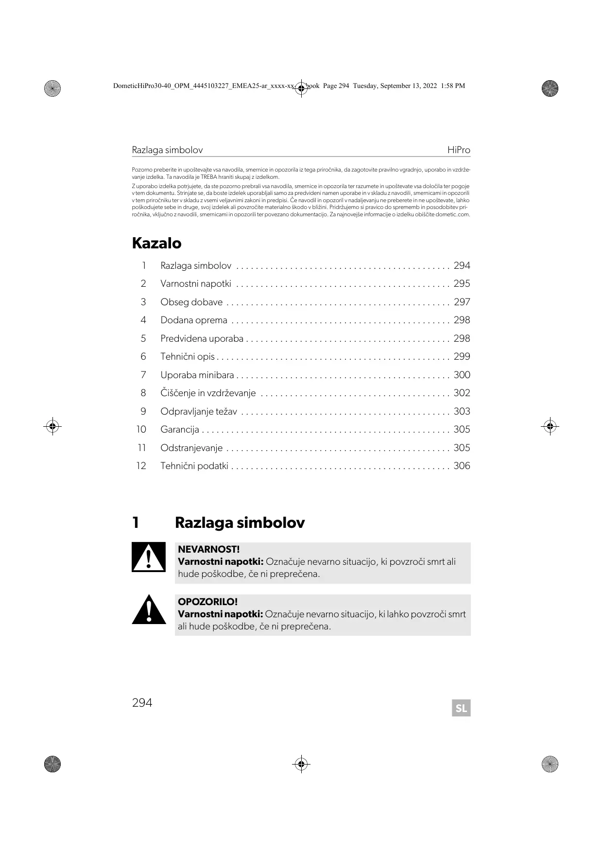 Razlaga simbolov NEVARNOST! Varnostni napotki: Označuje nevarno situacijo, ki povzroči smrt ali hude poškodbe, če ni preprečena. OPOZORILO! Varnostni napotki: Označuje nevarno situacijo, ki lahko povzroči smrt ali hude poškodbe, če ni preprečena.