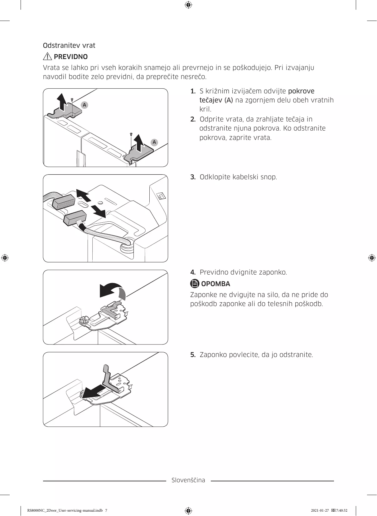 Odstranitev vrat PREVIDNO Vrata se lahko pri vseh korakih snamejo ali prevrnejo in se poškodujejo. Pri izvajanju navodil bodite zelo previdni, da preprečite nesrečo. 1. S križnim izvijačem odvijte pokrove tečajev (A) na zgornjem delu obeh vratnih kril.