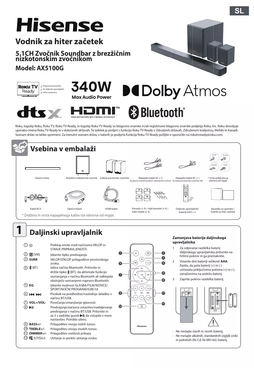 SL Vodnik za hiter začetek 5.1CH Zvočnik Soundbar z brezžičnim nizkotonskim zvočnikom Model: AX5100G Preprosta postavitev En daljinski upravljalnik Hitre nastavitve