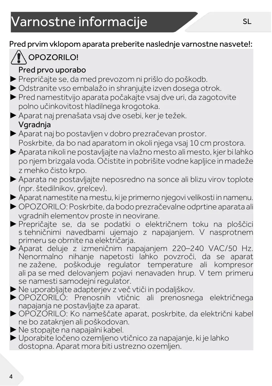 Nu folosiți pulberi de curățare sau alte produse de curățare abrazive. Nu spălați piesele detașabile în mașina de spălat vase. Nu răzuiți gheața cu obiecte ascuțite. Nu folosiți pulverizatoare, dispozitive electrice de încălzire precum radiatoare, uscătoare de păr, aparate de curățat cu abur sau alte surse de căldură, pentru a evita deteriorarea pieselor din plastic. AVERTISMENT: Nu utilizați dispozitive mecanice sau alte mijloace de a accelera procesul de decongelare, în afara celor recomandate de producător. În cazul în care cablul de alimentare este deteriorat, acesta trebuie înlocuit de către producător, agentul său de service sau persoane calificate similare, pentru a evita orice pericol.