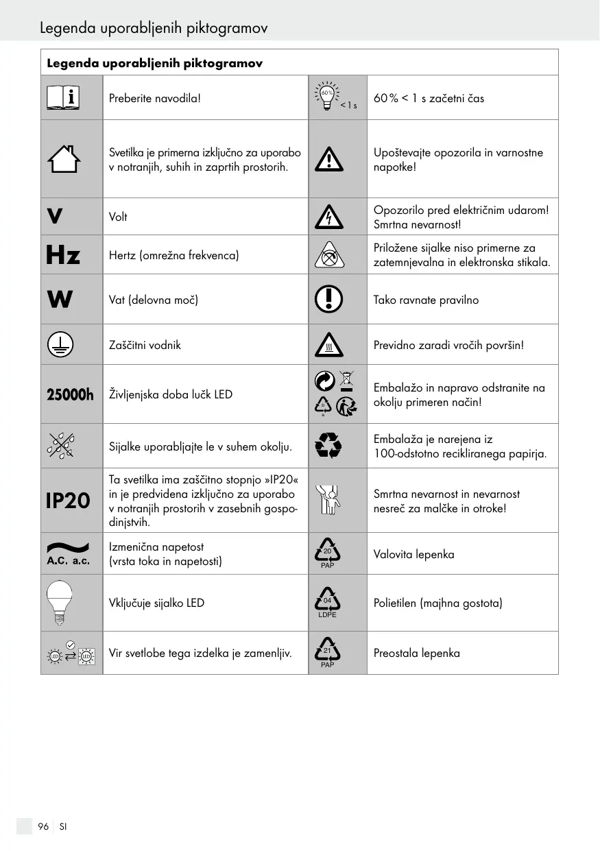 Ta svetilka ima zaščitno stopnjo »IP20« in je predvidena izključno za uporabo v notranjih prostorih v zasebnih gospodinjstvih.