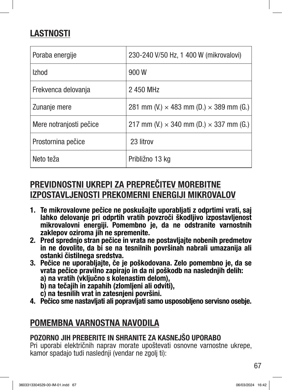 3603313304529-00-IM-01.indd 3 2. Ne faites pas fonctionner le four lorsqu’il est vide. 3. N’utilisez pas cet appareil si le cordon ou la fiche est endommagé, s’il ne fonctionne pas correctement, s’il a été endommagé ou s’il est tombé. Si le câble d’alimentation est endommagé, il doit être remplacé par le fabricant, son service après-vente ou des personnes de qualification similaire afin d’éviter un danger. 4. Réduire le risque d’incendie dans la cavité du four : • Pendant le chauffage de denrées alimentaires dans des récipients en plastique ou en papier, garder un œil sur le four en raison de la possibilité d’inflammation. • Retirez les attaches en fil de fer des sacs en papier ou en plastique avant de les placer dans le four. • Si de la fumée apparaît, arrêter ou débrancher l’appareil et garder la porte fermée pour étouffer les flammes éventuelles. • N’utilisez pas la cavité à des fins de stockage. Ne laissez pas de produits en papier, d’ustensiles de cuisine ou d’aliments dans la cavité lorsqu’elle n’est pas utilisée. 5. Ne faites pas frire les aliments dans le four. L’huile chaude peut endommager les pièces et les ustensiles du four et même provoquer des brûlures cutanées. 6. Percez les aliments à peau épaisse tels que les pommes de terre, les courges entières, les pommes et les châtaignes avant de les faire cuire. 7. Les ustensiles de cuisine peuvent devenir chauds en raison de la chaleur transférée par les aliments chauffés. Des maniques peuvent être nécessaires pour manipuler l’ustensile. 8. AVERTISSEMENT ! -- N’installez pas le four au-dessus d’une table de cuisson ou d’un autre appareil produisant de la chaleur, sous peine de l’endommager et d’annuler la garantie. 9. AVERTISSEMENT ! -- L’appareil et ses parties accessibles deviennent chauds pendant l’utilisation. 12. Le four à micro-ondes est destiné uniquement à la décongélation, à la cuisson et à l’étuvage des aliments. 13. Portez des gants si vous retirez des aliments chauffés. 14. Attention ! De la vapeur s’échappera lorsque vous ouvrirez les couvercles ou le papier d’aluminium. 15. MISE EN GARDE : les parties accessibles peuvent devenir chaudes au cours de l’utilisation. Il convient d’éloigner les jeunes enfants. 16. Lors de son utilisation, l’appareil devient chaud. Il convient de faire attention à ne pas toucher les éléments chauffants situés à l’intérieur du four. 17. L’appareil ne doit pas être installé derrière une porte décorative, afin d’éviter une surchauffe. 18. AVERTISSEMENT - RISQUE DE CHOC ÉLECTRIQUE ! N’immergez pas l’appareil, le câble ou la prise d’alimentation dans l’eau ni dans aucun autre liquide. N’utilisez pas l’appareil avec les mains mouillées. 19. La température des surfaces accessibles peut être élevée lorsque l’appareil est en fonctionnement. 20. Cet appareil peut être utilisé par des enfants à partir de 8 ans et plus et par des personnes ayant des capacités physiques, sensorielles ou mentales réduites ou un manque d’expérience et de connaissances à condition qu’elles aient reçu une supervision ou des instructions concernant l’utilisation de l’appareil en toute sécurité et qu’elles comprennent les dangers encourus. Les enfants ne doivent pas jouer avec l’appareil. Le nettoyage et l’entretien par l’usager ne doivent pas être effectués par des enfants, sauf s’ils ont plus de 8 ans et qu’ils sont surveillés. Maintenir l’appareil et son cordon hors de portée des enfants de moins de 8 ans. 21. Si le câble d’alimentation est endommagé, il doit être remplacé par le fabricant, son service après-vente ou des personnes de qualification similaire afin d’éviter un danger. 22. Cet appareil n’est pas destiné à être mis en fonctionnement au moyen d’une minuterie extérieure ou par un système de commande à distance séparé. 23. MISE EN GARDE : si la porte ou les joints de porte sont endommagés, le four ne doit pas être mis en fonctionnement avant d’avoir été réparé par une personne compétente. 24. MISE EN GARDE : il est dangereux pour quiconque autre qu’une personne 5 3603313304529-00-IM-01.indd 5