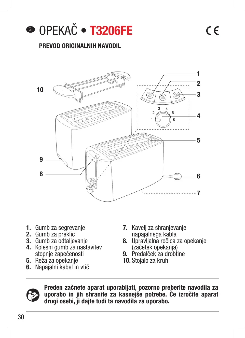 Opomba: Opekač omogoča pogrevanjeŽe popečenega kruha.