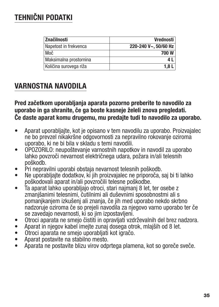 Značilnosti Napetost in frekvenca Moč Maksimalna prostornina Količina surovega riža Vrednosti 220-240 V~, 50/60 Hz 700 W 1,8 L VARNOSTNA NAVODILA Pred začetkom uporabljanja aparata pozorno preberite to navodilo za uporabo in ga shranite, če ga boste kasneje želeli znova pregledati. Če daste aparat komu drugemu, mu predajte tudi to navodilo za uporabo.