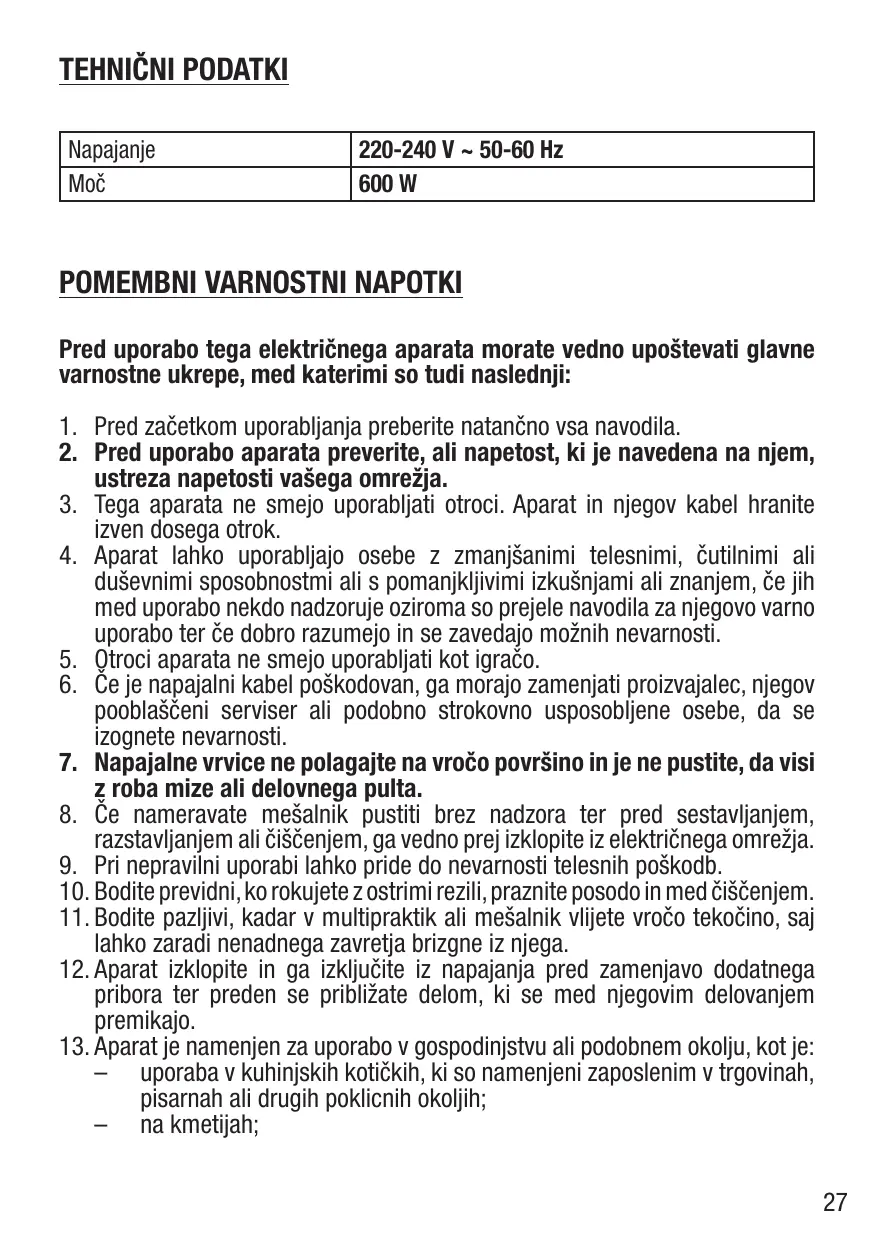 11. Tenga precaución cuando se añada un líquido caliente en el preparador culinario o en la batidora, ya que puede salir expulsado del aparato si hierve de repente. 12. Apague el aparato y desenchúfelo de la corriente antes de cambiar los accesorios o de acercarse a las piezas que son móviles cuando el aparato está en funcionamiento. 9