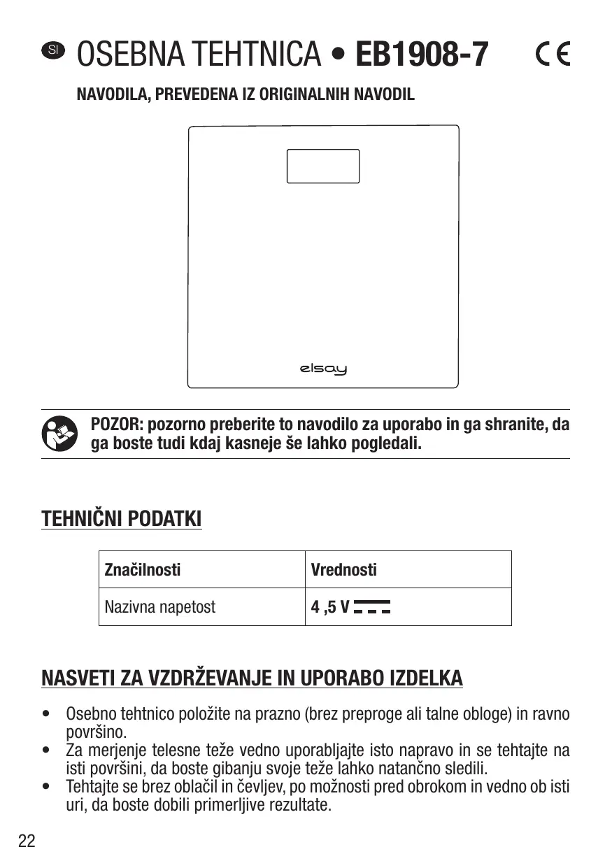 Značilnosti Vrednosti Nazivna napetost 4 ,5 V NASVETI ZA VZDRŽEVANJE IN UPORABO IZDELKA