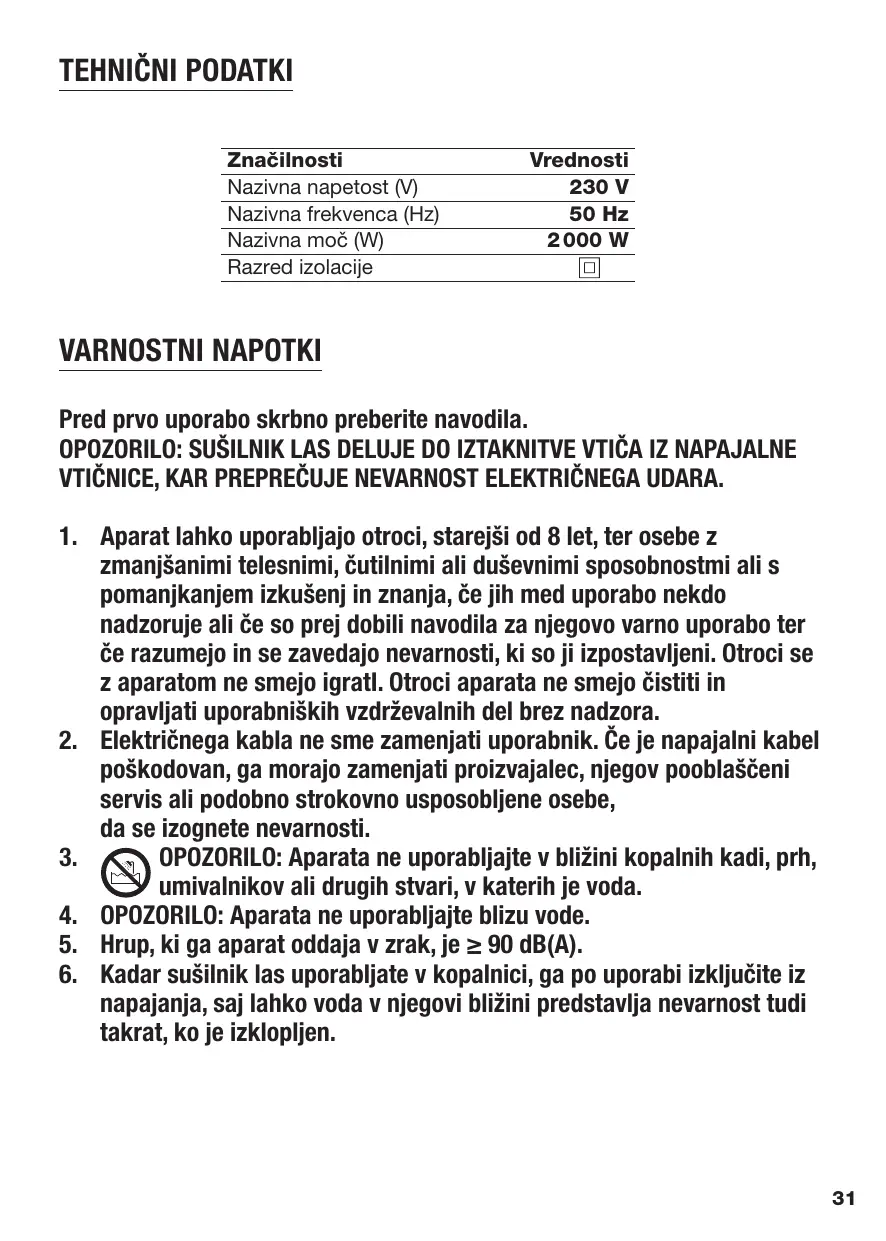 Značilnosti Nazivna napetost (V) Nazivna frekvenca (Hz) Nazivna moč (W) Razred izolacije Vrednosti 230 V 50 Hz 2 000 W VARNOSTNI NAPOTKI Pred prvo uporabo skrbno preberite navodila. OPOZORILO: SUŠILNIK LAS DELUJE DO IZTAKNITVE VTIČA IZ NAPAJALNE VTIČNICE, KAR PREPREČUJE NEVARNOST ELEKTRIČNEGA UDARA.