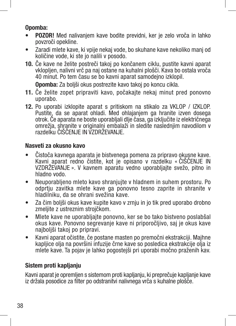 Opomba: Za boljši okus postrezite kavo takoj po koncu cikla. 11. Če želite zopet pripraviti kavo, počakajte nekaj minut pred ponovno uporabo. 12. Po uporabi izklopite aparat s pritiskom na stikalo za VKLOP / IZKLOP. Pustite, da se aparat ohladi. Med ohlajanjem ga hranite izven dosega otrok. Če aparata ne boste uporabljali dlje časa, ga izključite iz električnega omrežja, shranite v originalni embalaži in sledite naslednjim navodilom v razdelku ČIŠČENJE IN VZDRŽEVANJE. Nasveti za okusno kavo • Čistoča kavnega aparata je bistvenega pomena za pripravo okusne kave. Kavni aparat redno čistite, kot je opisano v razdelku « ČIŠČENJE IN VZDRŽEVANJE ». V kavnem aparatu vedno uporabljajte svežo, pitno in hladno vodo. • Neuporabljeno mleto kavo shranjujte v hladnem in suhem prostoru. Po odprtju zavitka mlete kave ga ponovno tesno zaprite in shranite v hladilniku, da se ohrani svežina kave. • Za čim boljši okus kave kupite kavo v zrnju in jo tik pred uporabo drobno zmeljite z ustreznim strojčkom. • Mlete kave ne uporabljajte ponovno, ker se bo tako bistveno poslabšal okus kave. Ponovno segrevanje kave ni priporočljivo, saj je okus kave najboljši takoj po pripravi. • Kavni aparat očistite, če postane masten po premočni ekstrakciji. Majhne kapljice olja na površini infuzije črne kave so posledica ekstrakcije olja iz mlete kave. Ta pojav je lahko pogostejši pri uporabi močno praženih kav. Sistem proti kapljanju Kavni aparat je opremljen s sistemom proti kapljanju, ki preprečuje kapljanje kave iz držala posodice za filter po odstranitvi nalivnega vrča s kuhalne plošče.
