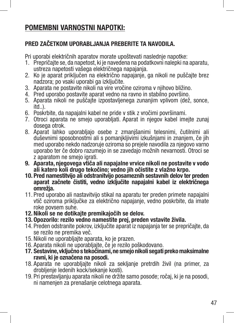 POMEMBNI VARNOSTNI NAPOTKI: PRED ZAČETKOM UPORABLJANJA PREBERITE TA NAVODILA. Pri uporabi električnih aparatov morate upoštevati naslednje napotke: 1. Prepričajte se, da napetost, ki je navedena na podatkovni nalepki na aparatu, ustreza napetosti vašega električnega napajanja. 2. Ko je aparat priključen na električno napajanje, ga nikoli ne puščajte brez nadzora; po vsaki uporabi ga izključite. 3. Aparata ne postavite nikoli na vire vročine oziroma v njihovo bližino. 4. Pred uporabo postavite aparat vedno na ravno in stabilno površino. 5. Aparata nikoli ne puščajte izpostavljenega zunanjim vplivom (dež, sonce, itd..). 6. Poskrbite, da napajalni kabel ne pride v stik z vročimi površinami. 7. Otroci aparata ne smejo uporabljati. Aparat in njegov kabel imejte zunaj dosega otrok. 8. Aparat lahko uporabljajo osebe z zmanjšanimi telesnimi, čutilnimi ali duševnimi sposobnostmi ali s pomanjkljivimi izkušnjami in znanjem, če jih med uporabo nekdo nadzoruje oziroma so prejele navodila za njegovo varno uporabo ter če dobro razumejo in se zavedajo možnih nevarnosti. Otroci se z aparatom ne smejo igrati. 9. Aparata, njegovega vtiča ali napajalne vrvice nikoli ne postavite v vodo ali katero koli drugo tekočino; vedno jih očistite z vlažno krpo. 10. Pred namestitvijo ali odstranitvijo posameznih sestavnih delov ter preden aparat začnete čistiti, vedno izključite napajalni kabel iz električnega omrežja. 11. Pred uporabo ali nastavitvijo stikal na aparatu ter preden primete napajalni vtič oziroma priključke za električno napajanje, vedno poskrbite, da imate roke povsem suhe. 12. Nikoli se ne dotikajte premikajočih se delov. 13. Opozorilo: rezilo vedno namestite prej, preden vstavite živila. 14. Preden odstranite pokrov, izključite aparat iz napajanja ter se prepričajte, da se rezilo ne premika več. 15. Nikoli ne uporabljajte aparata, ko je prazen. 16. Aparata nikoli ne uporabljajte, če je rezilo poškodovano. 17. Sestavine, vključno s tekočinami, ne smejo nikoli segati preko maksimalne ravni, ki je označena na posodi. 18. Aparata ne uporabljajte nikoli za sekljanje pretrdih živil (na primer, za drobljenje ledenih kock/sekanje kosti). 19. Pri prestavljanju aparata nikoli ne držite samo posode; ročaj, ki je na posodi, ni namenjen za prenašanje celotnega aparata. 47