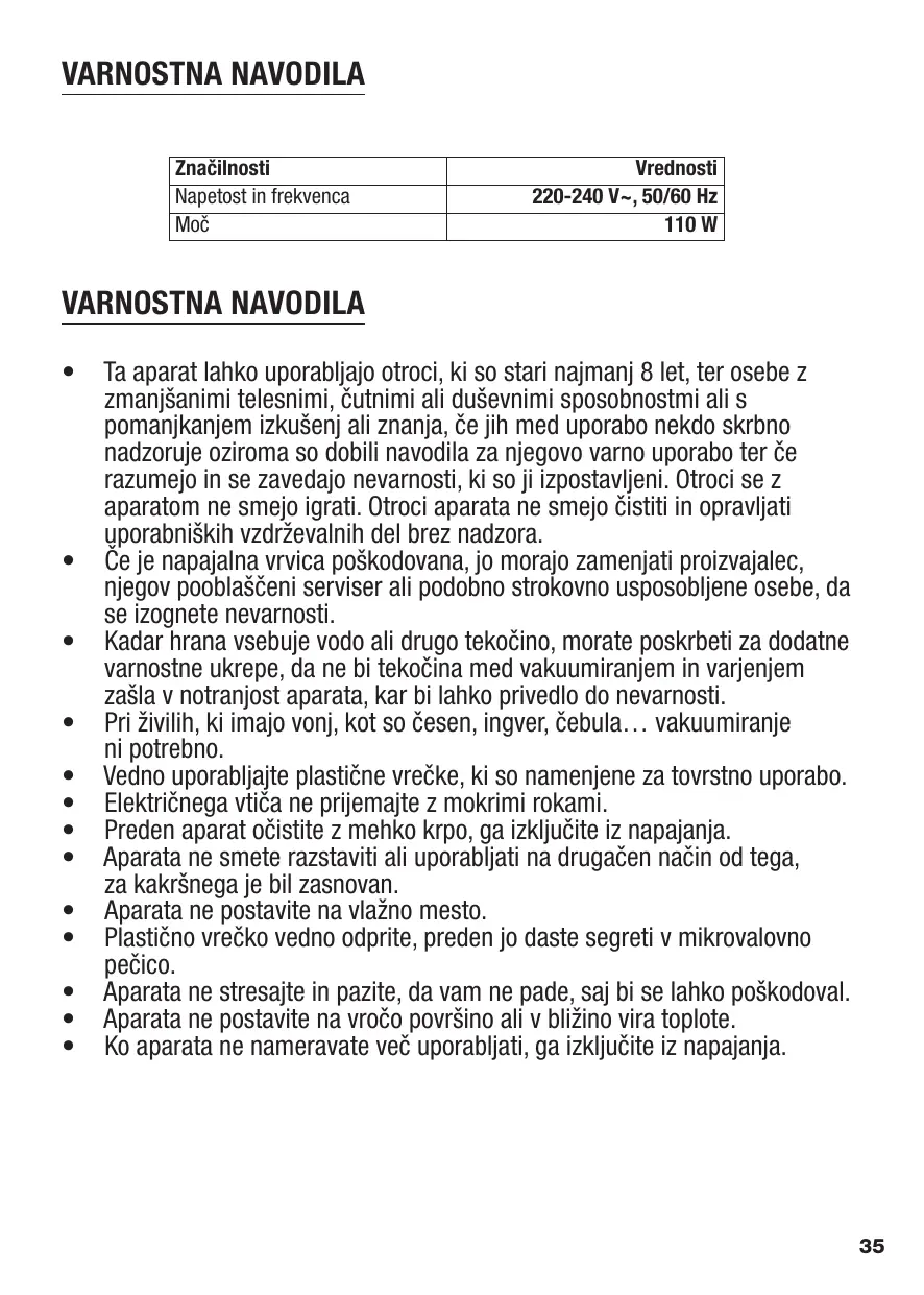 Ta aparat lahko uporabljajo otroci, ki so stari najmanj 8 let, ter osebe z zmanjšanimi telesnimi, čutnimi ali duševnimi sposobnostmi ali s pomanjkanjem izkušenj ali znanja, če jih med uporabo nekdo skrbno nadzoruje oziroma so dobili navodila za njegovo varno uporabo ter če razumejo in se zavedajo nevarnosti, ki so ji izpostavljeni. Otroci se z aparatom ne smejo igrati. Otroci aparata ne smejo čistiti in opravljati uporabniških vzdrževalnih del brez nadzora. Če je napajalna vrvica poškodovana, jo morajo zamenjati proizvajalec, njegov pooblaščeni serviser ali podobno strokovno usposobljene osebe, da se izognete nevarnosti. Kadar hrana vsebuje vodo ali drugo tekočino, morate poskrbeti za dodatne varnostne ukrepe, da ne bi tekočina med vakuumiranjem in varjenjem zašla v notranjost aparata, kar bi lahko privedlo do nevarnosti. Pri živilih, ki imajo vonj, kot so česen, ingver, čebula… vakuumiranje ni potrebno. Vedno uporabljajte plastične vrečke, ki so namenjene za tovrstno uporabo. Električnega vtiča ne prijemajte z mokrimi rokami. Preden aparat očistite z mehko krpo, ga izključite iz napajanja. Aparata ne smete razstaviti ali uporabljati na drugačen način od tega, za kakršnega je bil zasnovan. Aparata ne postavite na vlažno mesto. Plastično vrečko vedno odprite, preden jo daste segreti v mikrovalovno pečico. Aparata ne stresajte in pazite, da vam ne pade, saj bi se lahko poškodoval. Aparata ne postavite na vročo površino ali v bližino vira toplote. Ko aparata ne nameravate več uporabljati, ga izključite iz napajanja.