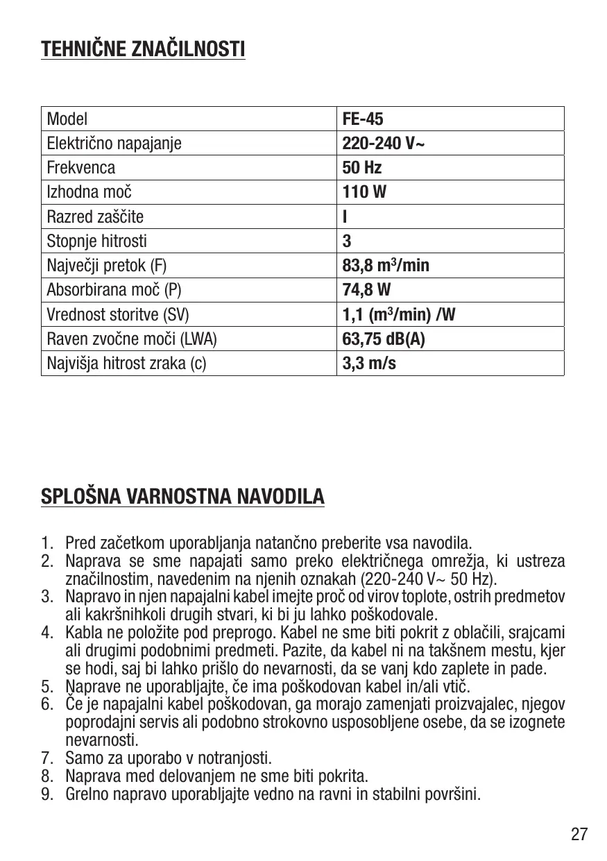 - Ventilatorja ne uporabljaje brez zašcitne mreže. Ventilatorja ne uporabljajte, ce so lopatie poškodovane ali razpokane.