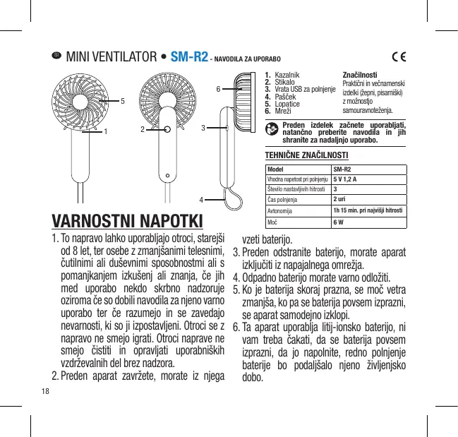 5. Lorsque la batterie est faible, la puissance du vent diminue et l’appareil s’éteint automatiquement après épuisement de la batterie 6. Cet appareil utilise une batterie au lithium-ion, vous n’avez pas à attendre que la batterie soit épuisée pour la recharger, charger régulièrement la batterie permet de prolonger sa durée de vie. 7. Lorsque le ventilateur fonctionne, les pales du ventilateur tournent très rapidement. Il est interdit d’insérer des objets à l’intérieur de l’appareil pour ne pas l’endommager. 8. Si vous n’utilisez pas le ventilateur pendant une longue période, vous devez recharger la batterie, la sceller dans un sac en plastique et la stocker dans un endroit sec et frais. 9. La durée de vie de la batterie sera considérablement réduite si : - la batterie est utilisée dans une température ambiante supérieure à 60°C, - la batterie est comprimée et fissurée, Ces risques peuvent également engendrer un risque de fuite ou d’explosion. 10. La batterie de l’appareil ne doit être remplacée que par une personne qualifiée. 11. L’appareil doit être alimenté uniquement sous la très basse tension de sécurité correspondant au marquage de l’appareil. 3