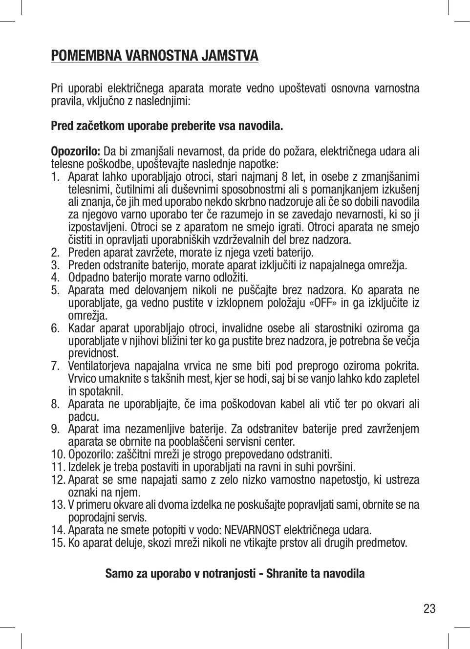 DC 5 V Avertissement : pour réduire les risques d’incendie, de choc électrique et de blessure, veuillez respecter les consignes suivantes : 1. Cet appareil peut être utilisé par des enfants âgés d’au moins 8 ans et par des personnes ayant des capacités physiques, sensorielles ou mentales réduites ou dénuées d’expérience ou de connaissance, s’ils (si elles) sont correctement surveillé(e)s ou si des instructions relatives à l’utilisation de l’appareil en toute sécurité leur ont été données et si les risques encourus ont été appréhendés. Les enfants ne doivent pas jouer avec l’appareil. Le nettoyage et l’entretien par l’usager ne doivent pas être effectués par des enfants sans surveillance. 2. La batterie doit être retirée de l’appareil avant que celui-ci ne soit mis au rebus ; 3. L’appareil doit être déconnecté du réseau d’alimentation lorsqu’on retire la batterie ; 4. La batterie doit être éliminée de façon sûre. 5. Ne laissez jamais l’appareil sans surveillance pendant son fonctionnement. Toujours laisser l’appareil en position «OFF» et le débrancher lorsqu’il n’est pas utilisé. 6. Une prudence accrue est nécessaire lorsque l’appareil est utilisé par ou à proximité d’enfants, de personnes invalides ou de personnes âgées, et lorsqu’il est laissé sans surveillance. 7. Le cordon du produit ne doit pas être placé sous des tapis, ou recouvert. Éloignez le cordon des zones de circulation pour ne pas trébucher. 8. Ne pas utiliser l’appareil avec un cordon ou une fiche endommagé, après un dysfonctionnement ou une chute. 9. Cet appareil contient des batteries non remplaçables. Pour retirer la batterie avant la mise au rebus, adressez-vous à un centre de service agréé. 10. Avertissement : il est strictement interdit d’enlever les grilles de protection. 11. Le produit doit être placé et utilisé sur une surface plate et sèche. 12. L’appareil doit être alimenté uniquement sous la très basse tension de sécurité correspondant au marquage de l’appareil. 13. En cas de dysfonctionnement ou de doute, ne pas essayer de réparer le produit par vous-même, contacter le service après-vente. 14. Ne pas immerger l’appareil : DANGER de choc électrique. 15. Ne jamais insérer les doigts ou tout objet à travers les grilles lorsque l’appareil fonctionne. Utilisation intérieure uniquement - Conserver ces instructions 3