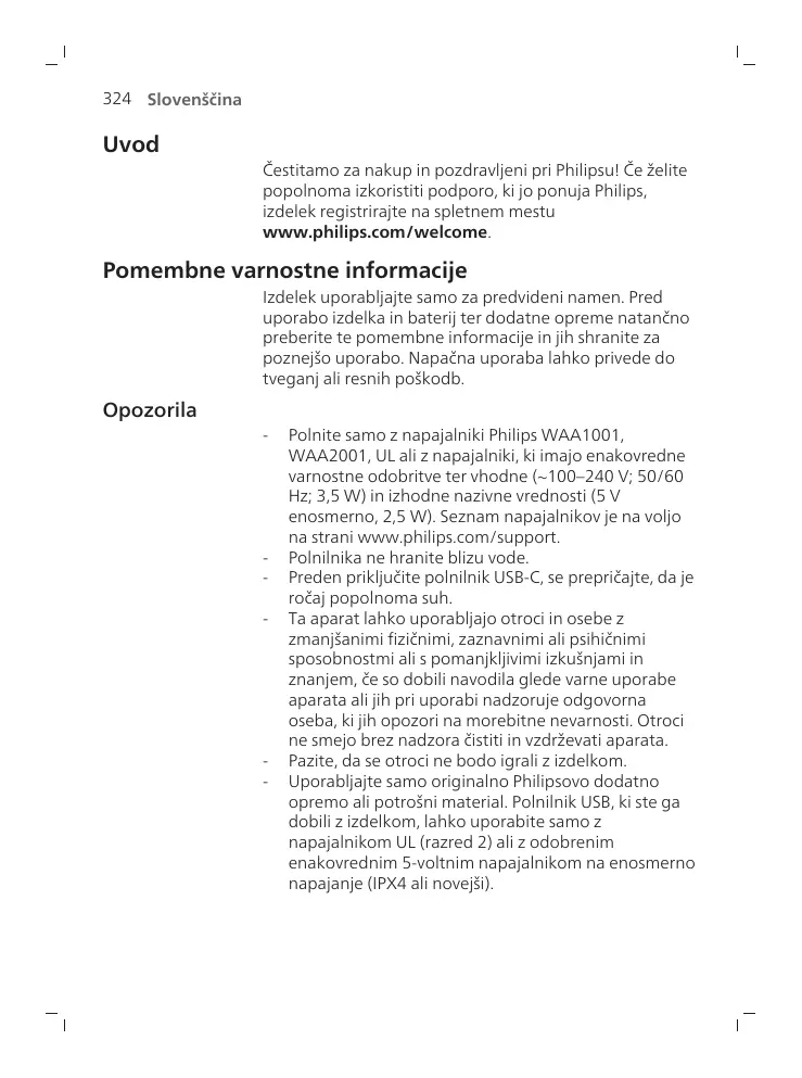 Ta aparat lahko uporabljajo otroci in osebe z zmanjéanimi fiziénimi, zaznavnimi ali psihiénimi sposobnostmi ali s pomanjkljivimi izkuënjami in znanjem, ée so dobili navodila glede varne uporabe aparata ali jih pri uporabi nadzoruje odgovorna oseba, ki jih opozori na morebitne nevarnosti. Otroci ne smejo brez nadzora ëistiti in vzdréevati aparata Pazite, da se otroci ne bodo igrali z izdelkom Uporabljajte samo originalno Philipsovo dodatno opremo ali potroëni material. Polnilnik USB, ki ste ga dobiliz izdelkom, lahko uporabite samo z napajalnikom UL (razred 2) ali z odobrenim enakovrednim 5-voltnim napajalnikom na enosmerno napajanje (IPX4 ali novejäi)