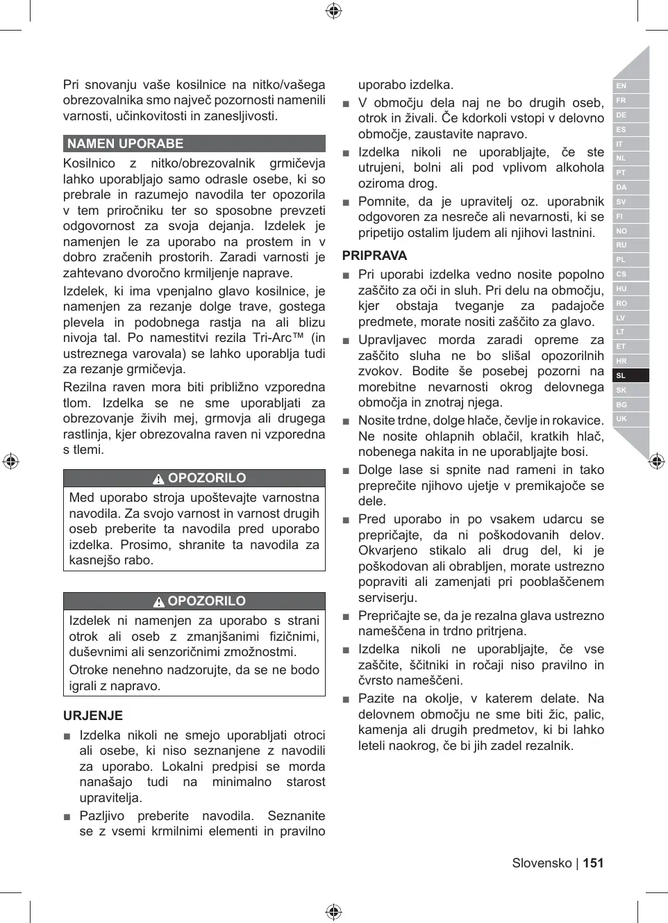 NAMEN UPORABE Kosilnico Zz nitko/obrezovalnik grmicevja lahko uporabljajo samo odrasle osebe, ki so prebrale in razumejo navodila ter opozorila v tem priroëniku ter so sposobne prevzeti odgovornost za svoja dejanja. Izdelek je namenjen le za uporabo na prostem in v dobro zraëenih prostorih. Zaradi varnosti je zahtevano dvoroëno krmiljenje naprave. Izdelek, ki ima vpenjalno glavo kosilnice, je namenjen za rezanje dolge trave, gostega plevela in podobnega rastja na ali blizu nivoja tal. Po namestitvi rezila Tri-Arc" (in ustreznega varovala) se lahko uporablja tudi Za rezanje grmicevja.