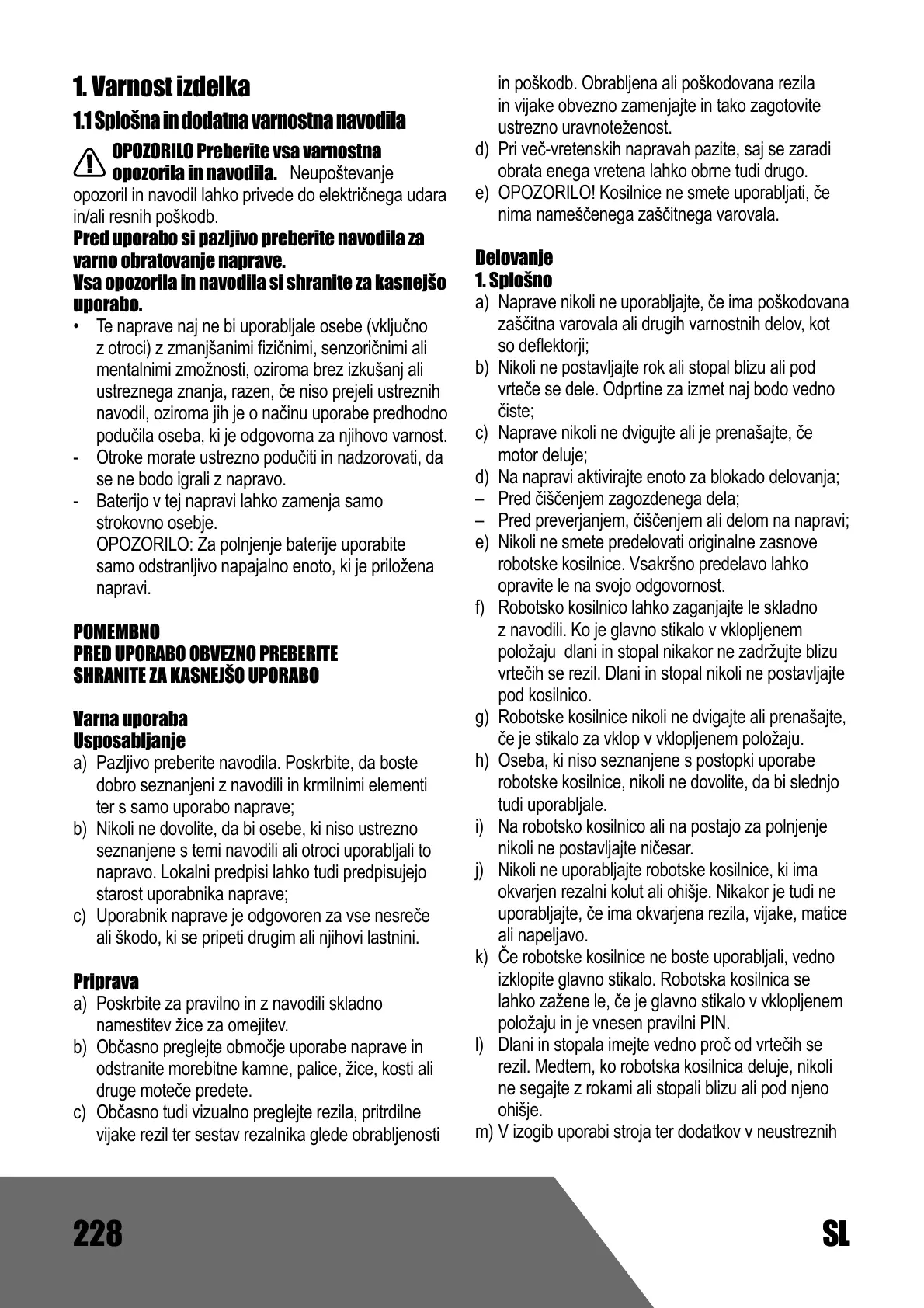 j) Nikoli ne uporabljaite robotske kosilnice, ki ima okvarjen rezalni kolut ali ohiëje. Nikakor je tudi ne uporabljaite, ée ima okvarjena rezila, vijake, matice ali napeljavo.