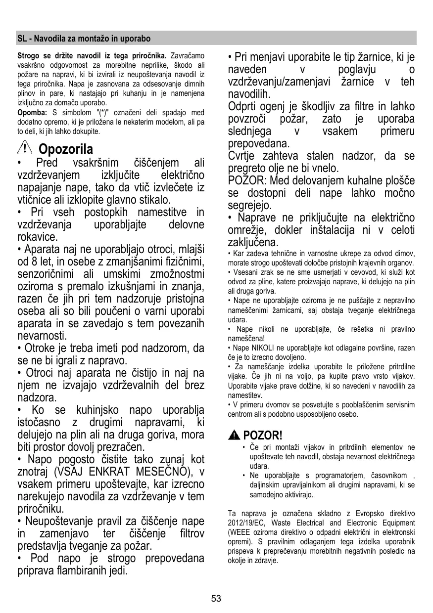 + La hotte ne doit JAMAIS être utilisée comme une surface d'appui, sauf indication expresse.