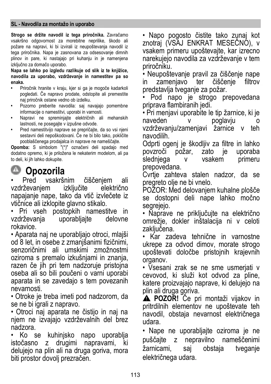 + La hotte ne doit JAMAIS être utilisée comme une surface d'appui, sauf indication expresse.