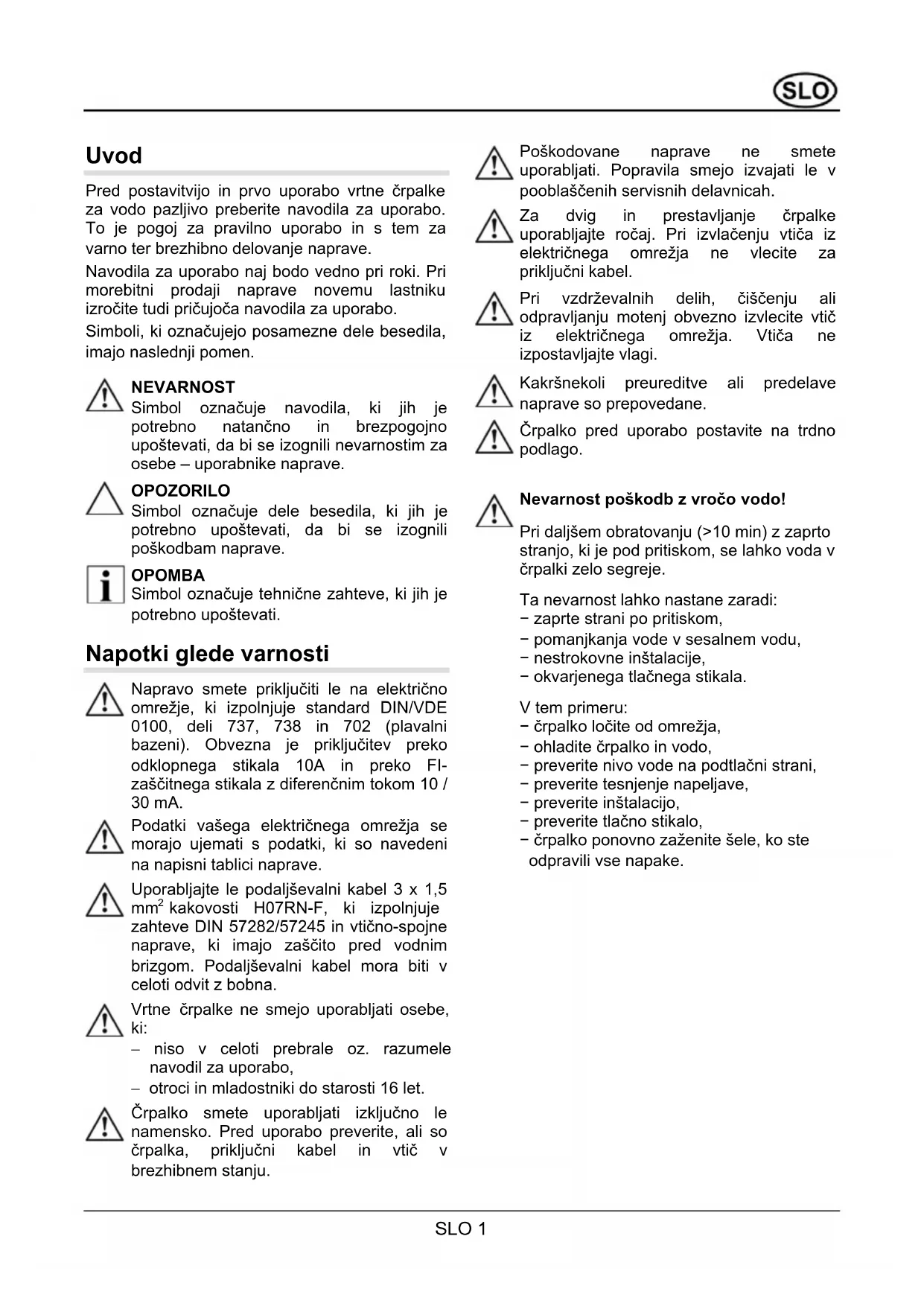 NEVARNOST Simbol označuje navodila, ki jih je potrebno natančno in brezpogojno upoštevati, da bi se izognili nevarnostim za osebe – uporabnike naprave. OPOZORILO Simbol označuje dele besedila, ki jih je potrebno upoštevati, da bi se izognili poškodbam naprave. OPOMBA Simbol označuje tehnične zahteve, ki jih je potrebno upoštevati. Napotki glede varnosti Napravo smete priključiti le na električno omrežje, ki izpolnjuje standard DIN/VDE 0100, deli 737, 738 in 702 (plavalni bazeni). Obvezna je priključitev preko odklopnega stikala 10A in preko FI- zaščitnega stikala z diferenčnim tokom 10 / 30 mA. Podatki vašega električnega omrežja se morajo ujemati s podatki, ki so navedeni na napisni tablici naprave. Uporabljajte le podaljševalni kabel 3 x 1,5