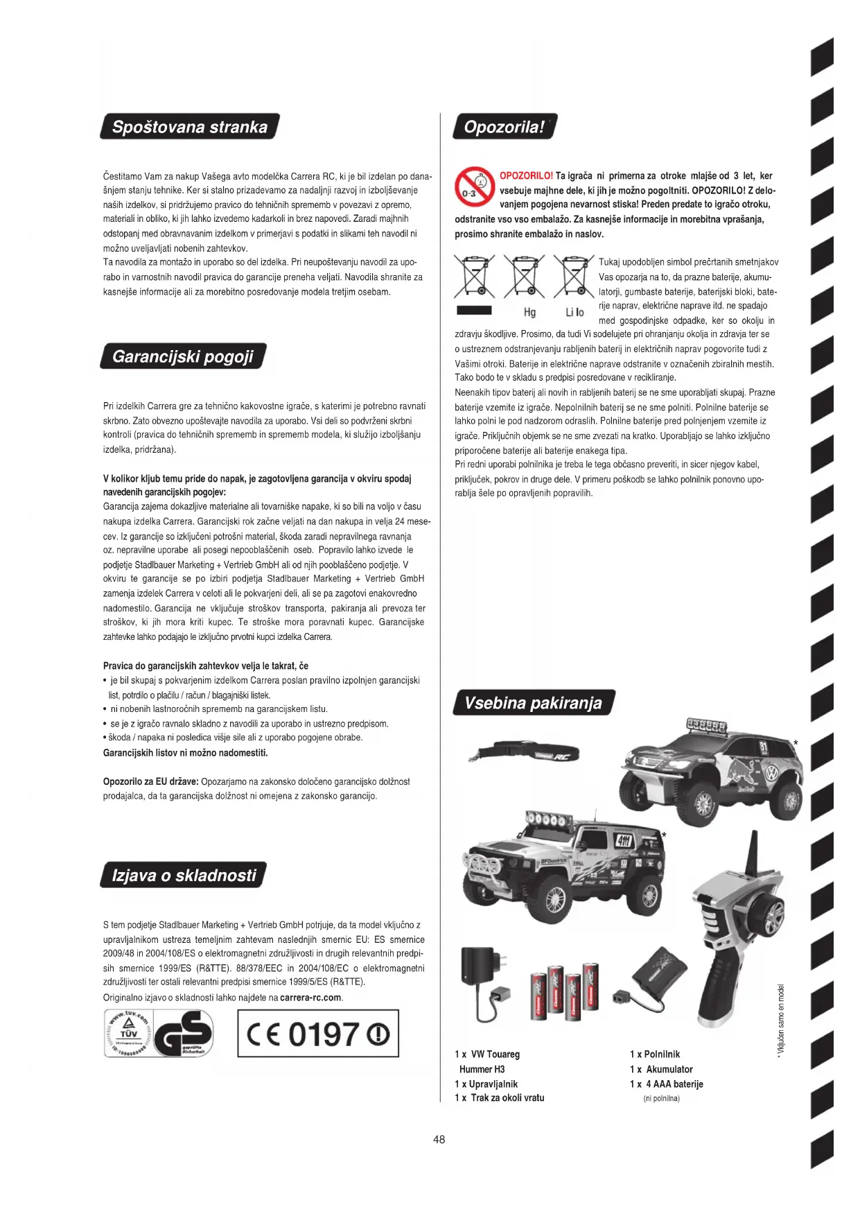 - škoda / napaka ni posledica višje sile ali z uporabo pogojene obrabe. Garancijskih listov ni možno nadomestiti. Opozorilo za EU države: Opozarjamo na zakonsko določeno garancijsko dolžnost prodajalca, da ta garancijska dolžnost ni omejena z zakonsko garancijo. Izjava o skladnosti S tem podjetje Stadlbauer Marketing + Vertrieb GmbH potrjuje, da ta model vključno z upravljalnikom ustreza temeljnim zahtevam naslednjih smernic EU: ES smernice 2009/48 in 2004/108/ES o elektromagnetni združljivosti in drugih relevantnih predpi- sih smernice 1999/ES (R&TTE). 88/378/EEC in 2004/108/EC o elektromagnetni združljivosti ter ostali relevantni predpisi smernice 1999/5/ES (R&TTE). Originalno izjavo o skladnosti lahko najdete na carrera-rc.com. Opozorila! OPOZORILO! Ta igrača ni primerna za otroke mlajše od 3 let, ker vsebuje majhne dele, ki jih je možno pogoltniti. OPOZORILO! Z delo- vanjem pogojena nevarnost stiska! Preden predate to igračo otroku, odstranite vso vso embalažo. Za kasnejše informacije in morebitna vprašanja, prosimo shranite embalažo in naslov. Tukaj upodobljen simbol prečrtanih smetnjakov Vas opozarja na to, da prazne baterije, akumu- latorji, gumbaste baterije, baterijski bloki, bate- rije naprav, električne naprave itd. ne spadajo med gospodinjske odpadke, ker so okolju in zdravju škodljive. Prosimo, da tudi Vi sodelujete pri ohranjanju okolja in zdravja ter se o ustreznem odstranjevanju rabljenih baterij in električnih naprav pogovorite tudi z Vašimi otroki. Baterije in električne naprave odstranite v označenih zbiralnih mestih. Tako bodo te v skladu s predpisi posredovane v recikliranje. Neenakih tipov baterij ali novih in rabljenih baterij se ne sme uporabljati skupaj. Prazne baterije vzemite iz igrače. Nepolnilnih baterij se ne sme polniti. Polnilne baterije se lahko polni le pod nadzorom odraslih. Polnilne baterije pred polnjenjem vzemite iz igrače. Priključnih objemk se ne sme zvezati na kratko. Uporabljajo se lahko izključno priporočene baterije ali baterije enakega tipa. Pri redni uporabi polnilnika je treba le tega občasno preveriti, in sicer njegov kabel, priključek, pokrov in druge dele. V primeru poškodb se lahko polnilnik ponovno upo- rablja šele po opravljenih popravilih. Vsebina pakiranja 1 x VW Touareg Hummer H3 1 x Upravljalnik 1 x Trak za okoli vratu 1 x Polnilnik 1 x Akumulator 1 x 4 AAA baterije (ni polnilna)1