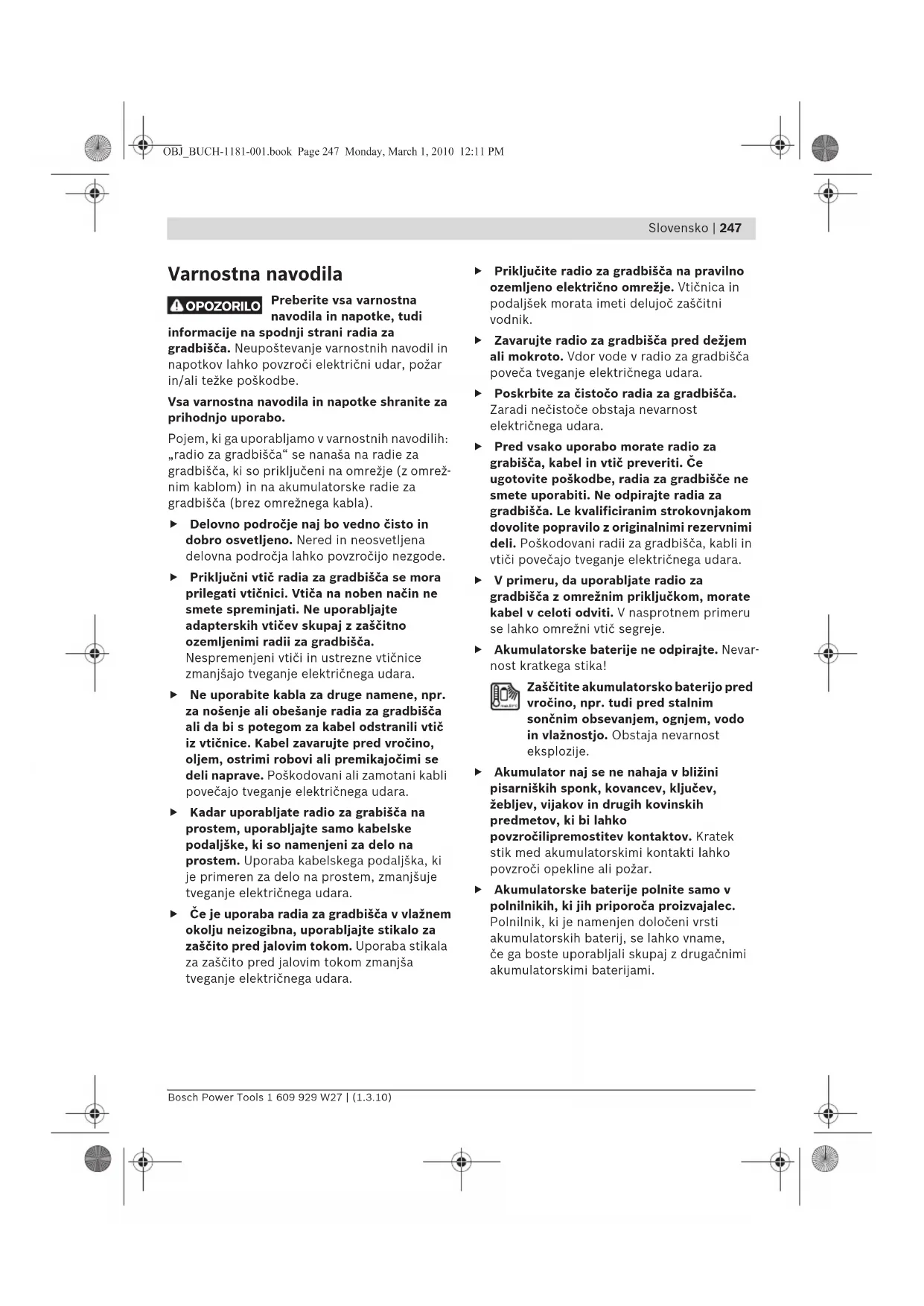 Vklopno/izklopna tipka za avdio obratovanje 27 Zaslon 28 „AUX 1 IN“ doza 29 Priključna doza 12 V 30 „LINE OUT“ doza 31 Pokrov varovalke 32 Varovalka priključka 12 V 33 Doza USB 34 Vtično mesto za SD/MMC 35 „AUX 2 IN“ doza 36 Držalo za zunanje avdio vire *Prikazan ali opisan pribor ni del standarnega obsega dobave. Celoten pribor je del našega programa pribora. Prikazovalni elementi pri avdio obratovanju a Prikaz prednastavitve zvoka b Prikaz spremembe nivoja višine c Prikaz spremembe nivoja globine d Prikaz glasnosti, pomnilnik radio postaj oz. prikaz naslova (odvisno od izbranega avdio vira) e Prikaz sprejema shranjenih postaj (pri vklopljenem radiju) f Prikaz naključnega oddajanja (pri avdio viru SD/MMC-kartica ali USB) g Prikaz ponovitve oddajanja vseh naslovov v aktualnem seznamu (pri avdio viru SD/MMC-kartica ali USB) h Prikaz ponovitve oddajanja aktualnih naslovov (pri avdio viru SD/MMC-kartica ali USB) i Prikaz stereo sprejema j Prikaz radijske frekvence oz. trajanja aktualnega naslova (odvisno od izbranega avdio vira) k Opozorilo o temperaturi l Prikaz, da je akumulatorska baterija vstavljena m Prikaz avdio vira n Prikaz časa OBJ_BUCH-1181-001.book Page 249 Monday, March 1, 2010 12:11 PM250 | Slovensko 1 609 929 W27 | (1.3.10) Bosch Power Tools Montaža Oskrba z energijo radia za gradbišča Oskrba za energijo radia za gradbišča se lahko izvede preko omrežnega priključka ali preko litij- ionske akumulatorske baterije, ki jo vstavite v vdolbino za akumulatorske baterije 11. Če je akumulatorska baterija namenjena za oskrbovanje z energijo, sta preko integriranega priključka USB na razpolago samo funkciji avdio obratovanja in oskrbovanja z energijo eksternih naprav. f Upoštevajte napetost omrežja! Napetost tokovnega vira pri omrežnem priključku se mora skladati z navedbami na tipski tablici radia za gradbišča. Radii za gradbišča, ki so označeni z 230 V, lahko delujejo z napetostjo 220 V. Namestitev/odstranitev akumulatorske baterije (glejte sliko A) f Uporabljajte le izključno originalne litij- ionske akumulatorske baterije 14,4 V ali 18 V. Uporaba drugih akumulatorskih baterij lahko povzroči opekline in nevarnost požara. Opozorilo: Uporaba akumulatorskih baterij, ki niso namenjene za radio za gradbišča, lahko povzroči napačno delovanje ali poškodbe radia za gradbišča. Odprite blokirno ročico 12 predalčka za akumulatorske energije („Battery Bay“) in odprite pokrov tega predalčka 13. Vstavite akumulatorsko baterijo tako v predvideno vdolbino 11, da ležijo priključki akumulatorske baterije na priključkih v vdolbini za akumulatorsko baterijo 11, ter pustite, da akumulatorska baterija zaskoči v tej vdolbini. Takoj, ko je akumulatorska baterija vstavljena, se na displeju pojavi prikaz l. Prikaz utripa v primeru, da postaja akumulatorska baterija prešibka. Če je akumulatorska baterija pretopla ali premrzla za delovanje, se na displeju pojavi prikaz opozorila o temperaturi k. Pred pričetkom obratovanja radia za gradbišča počakajte, da bo akumulatorska baterija dosegla primerno temperaturo. Če želiti vzeti ven akumulatorsko baterijo 14, pritisnite deblokirno tipko na akumulatorski bateriji in jo potegnite iz vdolbine 11. Po vstavljanju oz. snetju akumulatorske baterije zaprite pokrov predalčka za akumulatorske baterije 13. Zablokirajte pokrov predalčka za akumulatorske baterije tako, da blokirno ročico 12 zataknete na ohišju in jo nato potisnite navzdol. Polnjenje akumulatorske baterije f Uporabljajte le polnilne naprave, ki so navedene na strani pribora. Izključno te polnilne naprave so usklajene z uporabljenimi litij-ionskimi akumulatorkskimi baterijami vašega radia za gradbišča. Opozorilo: Akumulatorsko baterijo dobavimo delno izpraznjeno. Da bi lahko akumulatorska baterija razvila svojo polno zmogljivost, jo morate pred prvo uporabo v celoti napolniti v vklopljeni polnilni napravi. Litij-ionsko akumulatorsko baterijo lahko kadarkoli napolnite, ne da bi pri tem skrajšali življenjsko dobo. Prekinitev postopka polnjenja akumulatorske baterije ne poškoduje. Akumulatorska baterija je opremljena z nadzo- rom temperature NTC, ki dopušča samo polnje- nje v temperaturnem področju med 0 °C in 45 °C. S tem je zagotovljena dolga življenjska doba akumulatorske baterije. Namestitev/zamenjava izravnalnih baterij (glejte sliko A) Namestitev izravnalnih baterij je nujno v primeru, če želite na radiu shraniti nastavljen čas. V ta namen priporočamo uporabo alkalnih manganskih baterij. Odprite blokirno ročico 12 predalčka za akumulatorske energije („Battery Bay“) in odprite pokrov tega predalčka 13. Če je potrebno, snemite akumulatorsko baterijo 14. Če želite odpreti pokrov predalčka za baterije 7 pritisnite na aretiranje 6 in snemite pokrov predalčka za baterije. Vstavite izravnalne baterije. Pri tem pazite na pravilnost polov, kot je prikazano na notranji strani predalčka za baterije. OBJ_BUCH-1181-001.book Page 250 Monday, March 1, 2010 12:11 PMSlovensko | 251 Bosch Power Tools 1 609 929 W27 | (1.3.10) Ponovno nataknite pokrov 7 predalčka za izravnalne baterije.