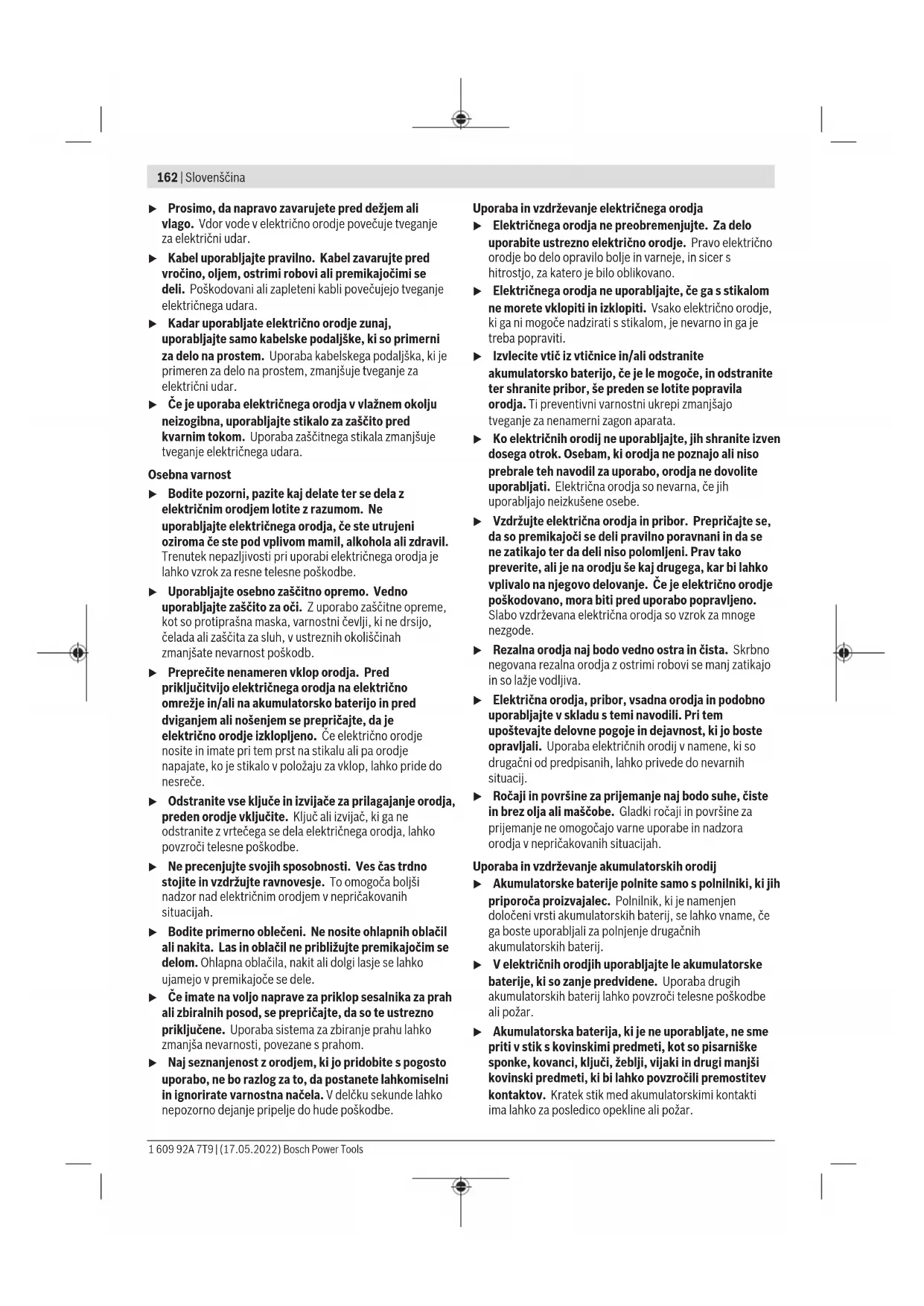 Montirajte paralelni graničnik (19) odn. ugaoni graničnik (23) pričvrsnim zavrtnjem (22) na električni alat. Montirajte, u skladu sa primenom, preklopivi graničnik (26) pričvrsnim zavrtnjem (25) na električni alat. Otpustite navrtanj za fiksiranje (21) i podesite željenu širinu preklopa na skali (20). Ponovo pritegnite navrtanj za fiksiranje (21). Podesite prema potrebi željenu dubinu preklopa preklopivim graničnikom (26). Prođite rendisanje više puta, sve dok se ne dostigne željena dubina falca. Vodite rende sa bočnim pritiskom naleganja. Iskošenje sa ugaonim graničnikom Podesite pri iskošenju preklopa i površina neophodni ugao iskosa podešavanjem ugla (24). Održavanje i servis Održavanje i čišćenje u Izvadite bateriju pre svih radova na električnom alatu (na primer održavanja, promene pribora itd.) kao i kod njegovog transporta i čuvanja. Kod slučajnog aktiviranja 1 609 92A 7T9 | (17.05.2022) Bosch Power ToolsSlovenščina | 161 prekidača za uključivanje/isključivanje postoji opasnost od povrede. u Držite električni alat i proreze za ventilaciju čiste, da bi dobro i sigurno radili. Servis i saveti za upotrebu Servis odgovara na vaša pitanja u vezi sa popravkom i održavanjem vašeg proizvoda kao i u vezi sa rezervnim delovima. Šematske prikaze i informacije u vezi rezervnih delova naći ćete i pod: www.bosch-pt.com Bosch tim za konsultacije vam rado pomaže tokom primene, ukoliko imate pitanja o našim proizvodima i njihovom priboru. Molimo da kod svih pitanja i naručivanja rezervnih delova neizostavno navedete broj artikla sa 10brojčanih mesta prema tipskoj pločici proizvoda. Srpski Bosch Elektroservis Dimitrija Tucovića 59 11000 Beograd Tel.: +381 11 644 8546 Tel.: +381 11 744 3122 Tel.: +381 11 641 6291 Fax: +381 11 641 6293 E-Mail: office@servis-bosch.rs www.bosch-pt.rs Dodatne adrese servisa pogledajte na: www.bosch-pt.com/serviceaddresses Transport Preporučeni litijum-jonski akumulatori podležu zahtevima propisa o opasnim materijama. Korisnik može bez dodatnih uslova transportovati akumulatore na drumu. Kod slanja preko trećih lica (na primer vazdušnih transportom ili špedicijom) mora se obratiti pažnja na posebne zahteve u pogledu pakovanja i označavanja. Tada se kod pripreme paketa za slanje mora pozvati stručnjak za opasne materije. Akumulatorske baterije šaljite samo ako kućište nije oštećeno. Odlepite otvorene kontakte i upakujte akumulatorsku bateriju tako, da se ne pokreće u paketu. Molimo da obratite pažnju na eventualne dalje nationalne propise. Uklanjanje đubreta Električne alate, akumulacione baterije, pribor i pakovanja treba predati na reciklažu koja je u skladu sa zaštitom životne sredine. Ne bacajte električne alate i akumulatore/ baterije u kućno djubre! Samo za EU‑zemlje: Prema evropskoj direktivi 2012/19/EU o starim električnim i elektronskim uređajima i njenoj primeni u nacionalnom pravu, električni alati koji se više ne mogu koristiti, a prema evropskoj direktivi 2006/66/EC akumulatori/baterije koje su u kvaru ili istrošene moraju se odvojeno sakupljati i uključiti u reciklažu koja ispunjava ekološke uslove. Ukoliko se elektronski i električni uređaji otklone u otpad na neispravan način, moguće opasne materije mogu da imaju štetno dejstvo na životnu sredinu i zdravlje ljudi. Akumulatorske baterije/baterije: Li-jonska: Molimo da obratite pažnju na napomene u odeljku Transport (videti „Transport“, Strana161). Slovenščina Varnostna opozorila Splošna varnostna navodila za električna orodja OPOZORILO Preberite vsa varnostna opozorila, navodila, ilustracije in specifikacije, ki so priložene temu električnemu orodju. Če spodaj navedenih napotkov ne upoštevate, lahko pride do električnega udara, požara in/ali težke poškodbe. Vsa opozorila in napotke shranite, ker jih boste v prihodnje še potrebovali. Pojem električno orodje, ki se pojavlja v nadaljnjem besedilu, se nanaša na električna orodja z električnim pogonom (z električnim kablom) in na akumulatorska električna orodja (brez električnega kabla). Varnost na delovnem mestu u Delovno mesto naj bo vedno čisto in dobro osvetljeno. Nered in neosvetljena delovna mesta povečajo možnost nezgod. u Električnega orodja ne uporabljajte v okolju, v katerem lahko pride do eksplozij (prisotnost vnetljivih tekočin, plinov ali prahu). Električna orodja povzročajo iskrenje, zaradi katerega se lahko prah ali hlapi vnamejo. u Ko uporabljate električno orodje, poskrbite, da v bližini ni otrok ali drugih oseb. Odvračanje pozornosti lahko povzroči izgubo nadzora nad orodjem. Električna varnost u Priključni vtič električnega orodja se mora prilegati vtičnici. Spreminjanje vtiča na kakršen koli način ni dovoljeno. Pri ozemljenih električnih orodjih ne uporabljajte adapterskih vtičev. Nespremenjeni vtiči in ustrezne vtičnice zmanjšujejo tveganje električnega udara. u Izogibajte se telesnemu stiku z ozemljenimi površinami, kot so na primer cevi, grelci, hladilniki in pašniki. Tveganje električnega udara je večje, če je vaše telo ozemljeno. Bosch Power Tools 1 609 92A 7T9 | (17.05.2022)162 | Slovenščina u Prosimo, da napravo zavarujete pred dežjem ali vlago. Vdor vode v električno orodje povečuje tveganje za električni udar. u Kabel uporabljajte pravilno. Kabel zavarujte pred vročino, oljem, ostrimi robovi ali premikajočimi se deli. Poškodovani ali zapleteni kabli povečujejo tveganje električnega udara. u Kadar uporabljate električno orodje zunaj, uporabljajte samo kabelske podaljške, ki so primerni za delo na prostem. Uporaba kabelskega podaljška, ki je primeren za delo na prostem, zmanjšuje tveganje za električni udar. u Če je uporaba električnega orodja v vlažnem okolju neizogibna, uporabljajte stikalo za zaščito pred kvarnim tokom. Uporaba zaščitnega stikala zmanjšuje tveganje električnega udara. Osebna varnost u Bodite pozorni, pazite kaj delate ter se dela z električnim orodj