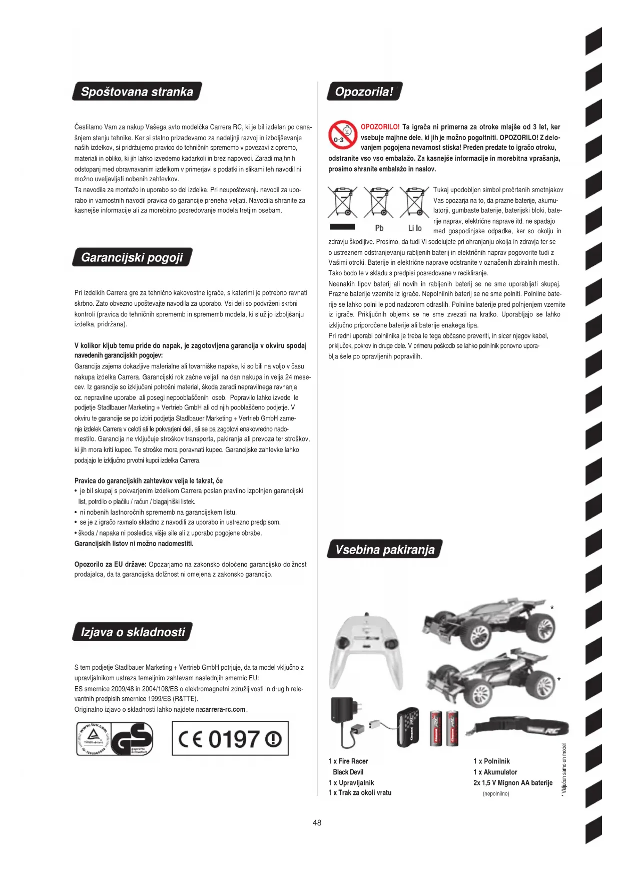 - Vključen samo en model Spoštovana stranka Čestitamo Vam za nakup Vašega avto modelčka Carrera RC, ki je bil izdelan po dana- šnjem stanju tehnike. Ker si stalno prizadevamo za nadaljnji razvoj in izboljševanje naših izdelkov, si pridržujemo pravico do tehničnih sprememb v povezavi z opremo, materiali in obliko, ki jih lahko izvedemo kadarkoli in brez napovedi. Zaradi majhnih odstopanj med obravnavanim izdelkom v primerjavi s podatki in slikami teh navodil ni možno uveljavljati nobenih zahtevkov. Ta navodila za montažo in uporabo so del izdelka. Pri neupoštevanju navodil za upo- rabo in varnostnih navodil pravica do garancije preneha veljati. Navodila shranite za kasnejše informacije ali za morebitno posredovanje modela tretjim osebam. Garancijski pogoji Pri izdelkih Carrera gre za tehnično kakovostne igrače, s katerimi je potrebno ravnati skrbno. Zato obvezno upoštevajte navodila za uporabo. Vsi deli so podvrženi skrbni kontroli (pravica do tehničnih sprememb in sprememb modela, ki služijo izboljšanju izdelka, pridržana). V kol ikor kljub temu pride d o napa k, je zagotovljena garancija v okviru spodaj navedenih garancijskih pogojev: Garancija zajema dokazljive materialne ali tovarniške napake, ki so bili na voljo v času nakupa izdelka Carrera. Garancijski rok začne veljati na dan nakupa in velja 24 mese- cev. Iz garancije so izključeni potrošni material, škoda zaradi nepravilnega ravnanja oz. nepravilne uporabe ali posegi nepooblaščenih oseb. Popravilo lahko izvede le podjetje Stadlbauer Marketing + Vertrieb GmbH ali od njih pooblaščeno podjetje. V okviru te garancije se po izbiri podjetja Stadlbauer Marketing + Vertrieb GmbH zame- nja izdelek Carrera v celoti ali le pokvarjeni deli, ali se pa zagotovi enakovredno nado- mestilo. Garancija ne vključuje stroškov transporta, pakiranja ali prevoza ter stroškov, ki jih mora kriti kupec. Te stroške mora poravnati kupec. Garancijske zahtevke lahko podajajo le izključno prvotni kupci izdelka Carrera. Pravica do garancijskih zahtevkov velja le ta krat, če