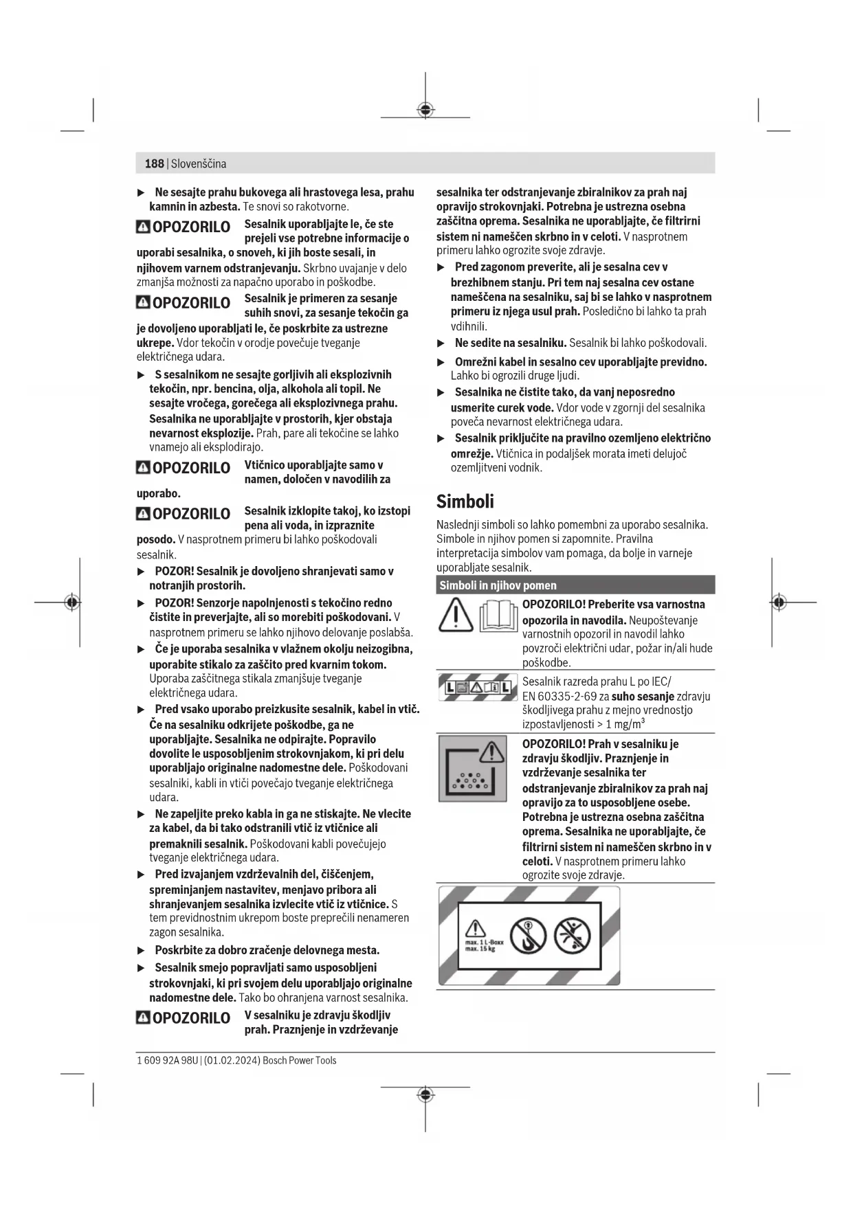 otroci ne bodo igrali s sesalnikom. u Upoštevajte vse varnostne predpise v zvezi z materiali, ki jih sesate. Bosch Power Tools 1 609 92A 98U | (01.02.2024)188 | Slovenščina