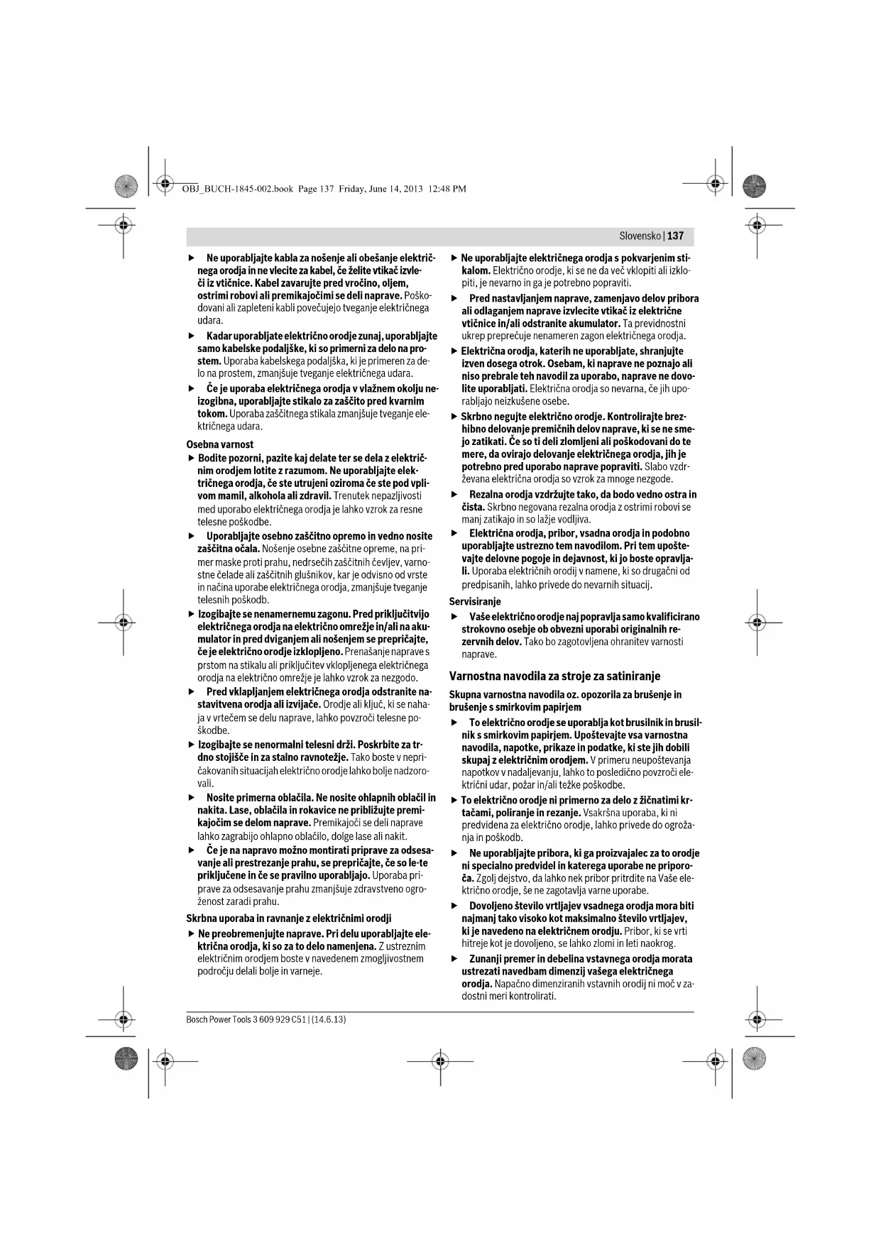 Kombinovani valjci sa krznom Za kalandriranje i matiranje metalnih površina fino 120 –240 Valjak sa krznom OBJ_BUCH-1845-002.book Page 135 Friday, June 14, 2013 12:48 PM136 | Slovensko 3 609 929 C51 | (14.6.13) Bosch Power Tools Radite sa umerenim pomeranjem napred i izvodite radnju brušenja paralelno i sa preklapanjem brusnih traka. Za postizajnje perfektne površine ne preskačite izbor brusnog sredstva više od jedne veličine zrna. Upotrebljavajte samo originalni Bosch brusni pribor. Samo besprekorno brusno sredstvao daje dobar učinak brušenja i čuva električni alat. Ne zatežite nikakve električne alate u radni sto. Zategnuti električni alati i upotrebljeni alati oštrih ivica mogu prouzrokovati teške povrede. Čuvanje brusnih sredstava Čuvajte brusna sredstva u originalnom pakovanju na 15 °C – 25 °C sobne temperature i 40 % – 70 % vlage vazduha. Ne čuvajte brusna sredstva na betonskim podovima, u blizini otvorenih prozora i grejanja. Ne lomite brusne trake, jer inače postaju neupotrebljive. Održavanje i servis Održavanje i čišćenje Izvucite pre svih radova na električnom alatu mrežni utikač iz utičnice. Držite električni alat i proreze za ventilaciju čiste, da bi dobro i sigurno radili. Uklanjajte nahvatanu brusnu prašinu sa nekom četkicom. Ako je potrebna zamena za priključni vod, onda to mora izvesti Bosch ili stručan servis za Bosch-električne alata da bi se izbegle opasnosti po sigurnost. Servisna služba i savetovanje o upotrebi Servisna služba odgovoriće na vaša pitanja o popravcima i održavanju vašeg proizvoda i o rezervnim delovima. Uvećane crteže i informacije o rezervnim delovima možete naći na našoj adresi: www.bosch-pt.com Bosch tim za savetovanje o upotrebi će vam rado pomoći ako imate pitanja o našim proizvodima i priboru. Molimo navedite neizostavno kod svih pitanja i naručivanja rezervnih delova broj predmeta sa 10 brojčanih mesta prema tipskoj tablici električnog alata. Srpski Bosch-Service Dimitrija Tucovića 59 11000 Beograd Tel.: (011) 2448546 Fax: (011) 2416293 E-Mail: asboschz@EUnet.yu Uklanjanje djubreta Električni pribori, pribor i pakovanja treba da se odvoze regeneraciji koja odgovara zaštiti čovekove sredine. Ne bacajte električni alat u kućno djubre! Samo za EU-zemlje: Prema evropskim smernicama 2012/19/EU o starim električnim i elektronskim uredjajima i njihovim pretvaranju u nacionalno dobro ne moraju više neupotrebljivi električni pribori da se odvojeno sakupljaju i odvoze nekoj reciklaži koja odgovara zaštiti čovekove okoline. Zadržavamo pravo na promene. Slovensko Varnostna navodila Splošna varnostna navodila za električna orodja Preberite vsa opozorila in napotila. Napake zaradi neupoštevanja spodaj navedenih opozoril in napotil lahko povzročijo električni udar, požar in/ali težke telesne poškodbe. Vsa opozorila in napotila shranite, ker jih boste v priho- dnje še potrebovali. Pojem „električno orodje“, ki se pojavlja v nadaljnjem besedi- lu, se nanaša na električna orodja z električnim pogonom (z električnim kablom) in na akumulatorska električna orodja (brez električnega kabla). Varnost na delovnem mestu Delovno področje naj bo vedno čisto in dobro osvetlje- no. Nered in neosvetljena delovna področja lahko povzro- čijo nezgode. Ne uporabljajte električnega orodja v okolju, kjer lahko pride do eksplozij oziroma tam, kjer se nahajajo vnetlji- ve tekočine, plini ali prah. Električna orodja povzročajo iskrenje, zaradi katerega se lahko prah ali para vnameta. Prosimo, da med uporabo električnega orodja ne dovo- lite otrokom ali drugim osebam, da bi se Vam približali. Odvračanje Vaše pozornosti drugam lahko povzroči izgubo kontrole nad napravo. Električna varnost Priključni vtikač električnega orodja se mora prilegati vtičnici. Spreminjanje vtikača na kakršenkoli način ni dovoljeno. Pri ozemljenih električnih orodjih ne upo- rabljajte vtikačev z adapterji. Nespremenjeni vtikači in ustrezne vtičnice zmanjšujejo tveganje električnega udara. Izogibajte se telesnemu stiku z ozemljenimi površinami kot so na primer cevi, grelci, štedilniki in hladilniki. Tve- ganje električnega udara je večje, če je Vaše telo ozemlje- no. Prosimo, da napravo zavarujete pred dežjem ali vlago. Vdor vode v električno orodje povečuje tveganje električ- nega udara. OPOZORILO OBJ_BUCH-1845-002.book Page 136 Friday, June 14, 2013 12:48 PMSlovensko | 137 Bosch Power Tools 3 609 929 C51 | (14.6.13) Ne uporabljajte kabla za nošenje ali obešanje električ- nega orodja in ne vlecite za kabel, če želite vtikač izvle- či iz vtičnice. Kabel zavarujte pred vročino, oljem, ostrimi robovi ali premikajočimi se deli naprave. Poško- dovani ali zapleteni kabli povečujejo tveganje električnega udara. Kadar uporabljate električno orodje zunaj, uporabljajte samo kabelske podaljške, ki so primerni za delo na pro- stem. Uporaba kabelskega podaljška, ki je primeren za de- lo na prostem, zmanjšuje tveganje električnega udara. Če je uporaba električnega orodja v vlažnem okolju ne- izogibna, uporabljajte stikalo za zaščito pred kvarnim tokom. Uporaba zaščitnega stikala zmanjšuje tveganje ele- ktričnega udara. Osebna varnost Bodite pozorni, pazite kaj delate ter se dela z električ- nim orodjem lotite z razumom. Ne uporabljajte elek- tričnega orodja, če ste utrujeni oziroma če ste pod vpli- vom mamil, alkohola ali zdravil. Trenutek nepazljivosti med uporabo električnega orodja je lahko vzrok za resne telesne poškodbe. Uporabljajte osebno zaščitno opremo in vedno nosite zaščitna očala. Nošenje osebne zaščitne opreme, na pri- mer maske proti prahu, nedrsečih zaščitnih čevljev, varno- stne čelade ali zaščitnih glušnikov, kar je odvisno od vrste in načina uporabe električnega orodja, zmanjšuje tveganje telesnih poškodb. Izogibajte se nenamernemu zagonu. Pred priključitvijo električnega orodja na električno omrežje in/ali na aku- mulator