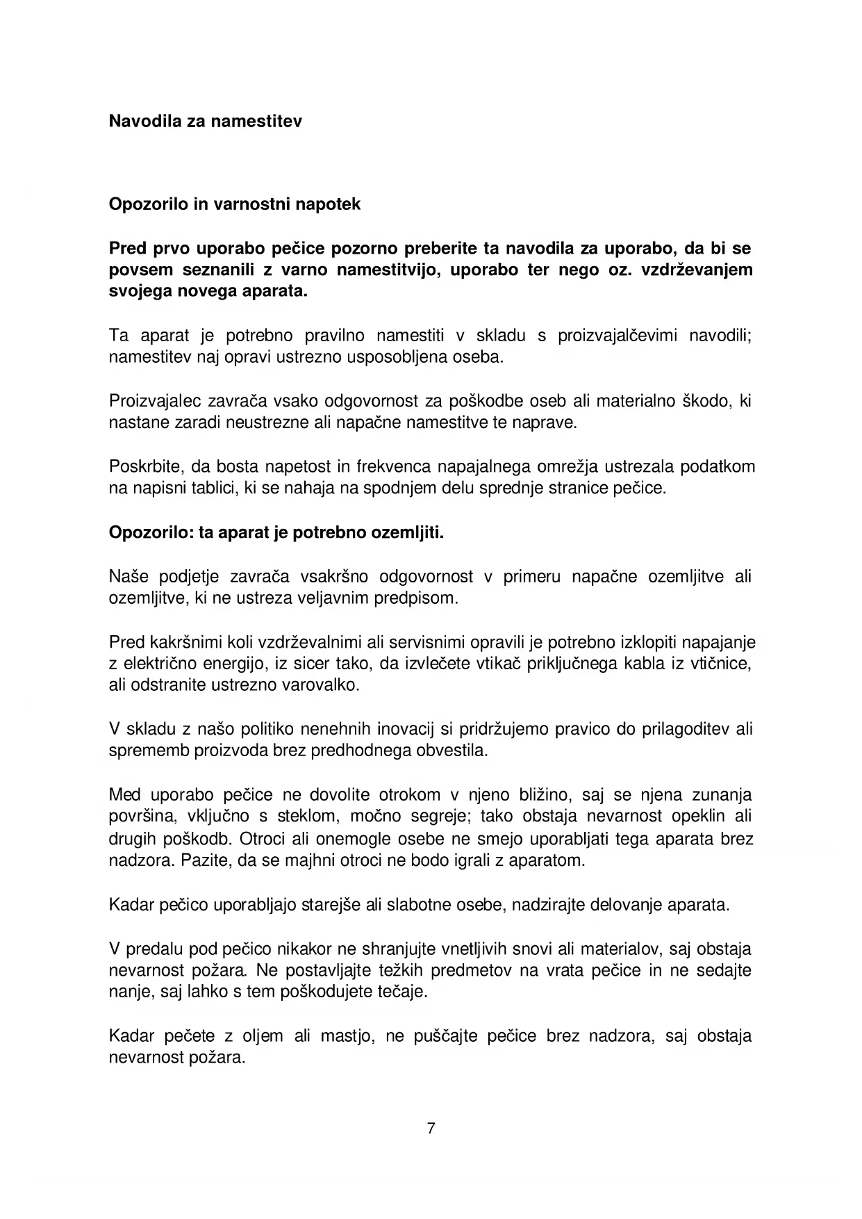 6Navodila za namestitev Opozorilo in varnostni napotek Pred prvo uporabo pečice pozorno preberite ta navodila za uporabo, da bi se povsem seznanili z varno namestitvijo, uporabo ter nego oz. vzdrževanjem svojega novega aparata. Ta aparat je potrebno pravilno namestiti v skladu s proizvajalčevimi navodili; namestitev naj opravi ustrezno usposobljena oseba. Proizvajalec zavrača vsako odgovornost za poškodbe oseb ali materialno škodo, ki nastane zaradi neustrezne ali napačne namestitve te naprave. Poskrbite, da bosta napetost in frekvenca napajalnega omrežja ustrezala podatkom na napisni tablici, ki se nahaja na spodnjem delu sprednje stranice pečice. Opozorilo: ta aparat je potrebno ozemljiti. Naše podjetje zavrača vsakršno odgovornost v primeru napačne ozemljitve ali ozemljitve, ki ne ustreza veljavnim predpisom. Pred kakršnimi koli vzdrževalnimi ali servisnimi opravili je potrebno izklopiti napajanje z električno energijo, iz sicer tako, da izvlečete vtikač priključnega kabla iz vtičnice, ali odstranite ustrezno varovalko. V skladu z našo politiko nenehnih inovacij si pridržujemo pravico do prilagoditev ali sprememb proizvoda brez predhodnega obvestila. Med uporabo pečice ne dovolite otrokom v njeno bližino, saj se njena zunanja površina, vključno s steklom, močno segreje; tako obstaja nevarnost opeklin ali drugih poškodb. Otroci ali onemogle osebe ne smejo uporabljati tega aparata brez nadzora. Pazite, da se majhni otroci ne bodo igrali z aparatom. Kadar pečico uporabljajo starejše ali slabotne osebe, nadzirajte delovanje aparata. V predalu pod pečico nikakor ne shranjujte vnetljivih snovi ali materialov, saj obstaja nevarnost požara. Ne postavljajte težkih predmetov na vrata pečice in ne sedajte nanje, saj lahko s tem poškodujete tečaje. Kadar pečete z oljem ali mastjo, ne puščajte pečice brez nadzora, saj obstaja nevarnost požara. 7Da bi preprečili poškodbe emajliranih površin v notranjosti, ne postavljajte posod ali pekačev na dno pečice in ne oblagajte dna pečice z aluminijevo folijo. Med peko hrana oddaja paro. Da ne bi prišlo do presežnega kopičenja pare v pečici, le-ta odvečno paro odvede skozi prezračevalne odprtine. Ta para lahko kondenzira in tako na hladnih zunanjih stenah pečice nastanejo kapljice; zato bo morda med peko potrebno z mehko krpo obrisati odvečno vlago. Tako boste tudi preprečili nalaganje umazanije ali razbarvanje zunanjih površin pečice, ki bi ju lahko povzročila para, ki med peko izhaja iz hrane. Pred prvo uporabo Pred čiščenjem izklopite pečico, tako da izvlečete vtikač priključnega kabla iz vtičnice ali odstranite varovalko. Odstranite morebitne dele embalaže ter pripomočke iz pečice. Obrišite notranjost pečice z vročo vodo ter blagim detergentom. Pozorno izperite pečico s pomočjo vlažne krpe. Police pečice ter pripomočke pomijte v pomivalnem stroju, ali z vročo vodo in blagim detergentom; nato jih temeljito posušite. Tehnični podatki Ta aparat ustreza standardom 73/23 CEE ter 93/68 CEE EMC 89/336 CEE. Napetost ≈ 220-240 V faza + nevtralni vod Mere vgradne pečice (mm): Dolžina: 598 Globina: 565,5 Višina : 600,3 Prostornina: 61 litrov