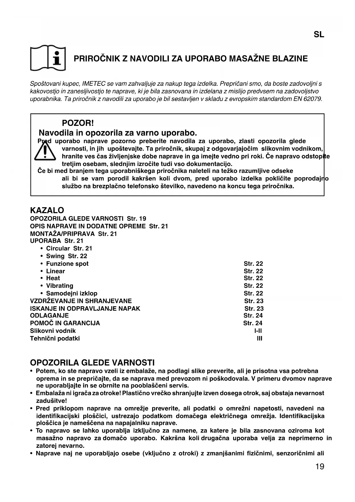 KAZALO OPOZORILA GLEDE VARNOSTI Str. 19