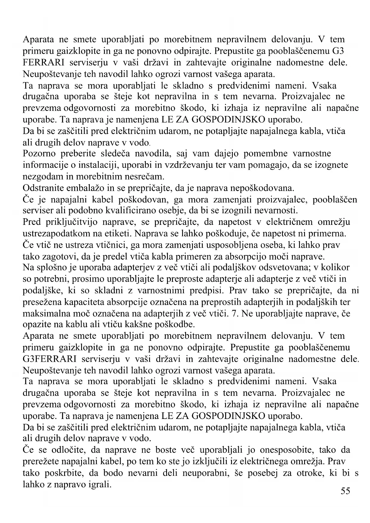 Pozorno preberite sledeča navodila, saj vam dajejo pomembne varnostne informacije o instalaciji, uporabi in vzdrževanju ter vam pomagajo, da se izognete nezgodam in morebitnim nesrečam. Odstranite embalažo in se prepričajte, da je naprava nepoškodovana. Če je napajalni kabel poškodovan, ga mora zamenjati proizvajalec, pooblaščen serviser ali podobno kvalificirano osebje, da bi se izognili nevarnosti. Pred priključitvijo naprave, se prepričajte, da napetost v električnem omrežju ustrezapodatkom na etiketi. Naprava se lahko poškoduje, če napetost ni primerna. Če vtič ne ustreza vtičnici, ga mora zamenjati usposobljena oseba, ki lahko prav tako zagotovi, da je predel vtiča kabla primeren za absorpcijo moči naprave. Na splošno je uporaba adapterjev z več vtiči ali podaljškov odsvetovana; v kolikor so potrebni, prosimo uporabljajte le preproste adapterje ali adapterje z več vtiči in podaljške, ki so skladni z varnostnimi predpisi. Prav tako se prepričajte, da ni presežena kapaciteta absorpcije označena na preprostih adapterjih in podaljških ter maksimalna moč označena na adapterjih z več vtiči. 7. Ne uporabljajte naprave, če opazite na kablu ali vtiču kakšne poškodbe.55 Aparata ne smete uporabljati po morebitnem nepravilnem delovanju. V tem primeru gaizklopite in ga ne ponovno odpirajte. Prepustite ga pooblaščenemu G3 FERRARI serviserju v vaši državi in zahtevajte originalne nadomestne dele. Neupoštevanje teh navodil lahko ogrozi varnost vašega aparata. Ta naprava se mora uporabljati le skladno s predvidenimi nameni. Vsaka drugačna uporaba se šteje kot nepravilna in s tem nevarna. Proizvajalec ne prevzema odgovornosti za morebitno škodo, ki izhaja iz nepravilne ali napačne uporabe. Ta naprava je namenjena LE ZA GOSPODINJSKO uporabo. Da bi se zaščitili pred električnim udarom, ne potapljajte napajalnega kabla, vtiča ali drugih delov naprave v vodo. Pozorno preberite sledeča navodila, saj vam dajejo pomembne varnostne informacije o instalaciji, uporabi in vzdrževanju ter vam pomagajo, da se izognete nezgodam in morebitnim nesrečam. Odstranite embalažo in se prepričajte, da je naprava nepoškodovana. Če je napajalni kabel poškodovan, ga mora zamenjati proizvajalec, pooblaščen serviser ali podobno kvalificirano osebje, da bi se izognili nevarnosti. Pred priključitvijo naprave, se prepričajte, da napetost v električnem omrežju ustrezapodatkom na etiketi. Naprava se lahko poškoduje, če napetost ni primerna. Če vtič ne ustreza vtičnici, ga mora zamenjati usposobljena oseba, ki lahko prav tako zagotovi, da je predel vtiča kabla primeren za absorpcijo moči naprave. Na splošno je uporaba adapterjev z več vtiči ali podaljškov odsvetovana; v kolikor so potrebni, prosimo uporabljajte le preproste adapterje ali adapterje z več vtiči in podaljške, ki so skladni z varnostnimi predpisi. Prav tako se prepričajte, da ni presežena kapaciteta absorpcije označena na preprostih adapterjih in podaljških ter maksimalna moč označena na adapterjih z več vtiči. 7. Ne uporabljajte naprave, če opazite na kablu ali vtiču kakšne poškodbe. Aparata ne smete uporabljati po morebitnem nepravilnem delovanju. V tem primeru gaizklopite in ga ne ponovno odpirajte. Prepustite ga pooblaščenemu G3FERRARI serviserju v vaši državi in zahtevajte originalne nadomestne dele. Neupoštevanje teh navodil lahko ogrozi varnost vašega aparata. Ta naprava se mora uporabljati le skladno s predvidenimi nameni. Vsaka drugačna uporaba se šteje kot nepravilna in s tem nevarna. Proizvajalec ne prevzema odgovornosti za morebitno škodo, ki izhaja iz nepravilne ali napačne uporabe. Ta naprava je namenjena LE ZA GOSPODINJSKO uporabo. Da bi se zaščitili pred električnim udarom, ne potapljajte napajalnega kabla, vtiča ali drugih delov naprave v vodo. Če se odločite, da naprave ne boste več uporabljali jo onesposobite, tako da prerežete napajalni kabel, po tem ko ste jo izključili iz električnega omrežja. Prav tako poskrbite, da bodo nevarni deli neuporabni, še posebej za otroke, ki bi se lahko z napravo igrali.56 Ne dotikajte se toplih površin. Uporabljajte ročaje ali gumbe. Med delovanjem pečice ohranjajte najmanj 4 inče (~10 cm) prostora na vseh straneh, daomogočite ustrezno kroženje zraka. Prevelika živila in kovinske posode ne smete postavljati v pečico, saj lahko ustvarijo požar ali nevarnost električnega udara. Pica, kruh in druge vrste hrane lahko zgorijo. Naprava naj bo daleč od zaves ali drugihgorljivih materialov. Požar se lahko pojavi, če je pečica med delovanjem prekrita ali se dotika vnetljivih materialov, vključno z zavesami, zastori, stenami in podobno. Ne shranjujte stvari v pečici. V pečico ne ustavljajte teh snovi: karton, plastika, papir in podobno. Kadar naprava ni v uporabi, v notranjosti pečice ne shranjujte nobenih materialov, razen tistih, ki jih proizvajalec priporoča kot dodatno opremo. Pečica je izključena le kadar ni povezana na napajanje. Vedno vlecite za vtič in ne zanapajalni kabel. Pozor! Postavite peč za pico v ustrezen položaj za nemoteno odpiranje pokrova, tako iz leve, kot tudi iz desne strani. Ne odpirajte pokrova, kadar ste pred pečico, para je zelo vroča! Odprite pokrov na enak način, kot odpirate pokrovko ponve med kuhanjem. Vedno nosite zaščitne, izolirane rokavice za pečico pri vstavljanju ali odstranjevanju predmetov iz vroče pečice. Naj drugi potencialni uporabniki pečice preberejo ta navodila. Shranite ta navodila. OPIS To je električna pečica, posebej razvita za pripravo pic, zasnovana in opremljena s kamnito kuhinjsko podlago – katere glavna karakteristika je enakomerno oddajanje toplote in absorbiranje vlage, ki jo vsebuje pripravljeno testo. Pečica je primerna za pripravo domače, dišeče in hrustljave pice, pečene na istem kamnu, kot se uporablja v krušnih pečeh na drva, v najbolj priznanih picerijah. To je najbolj primeren način za obuditev vonja in okus