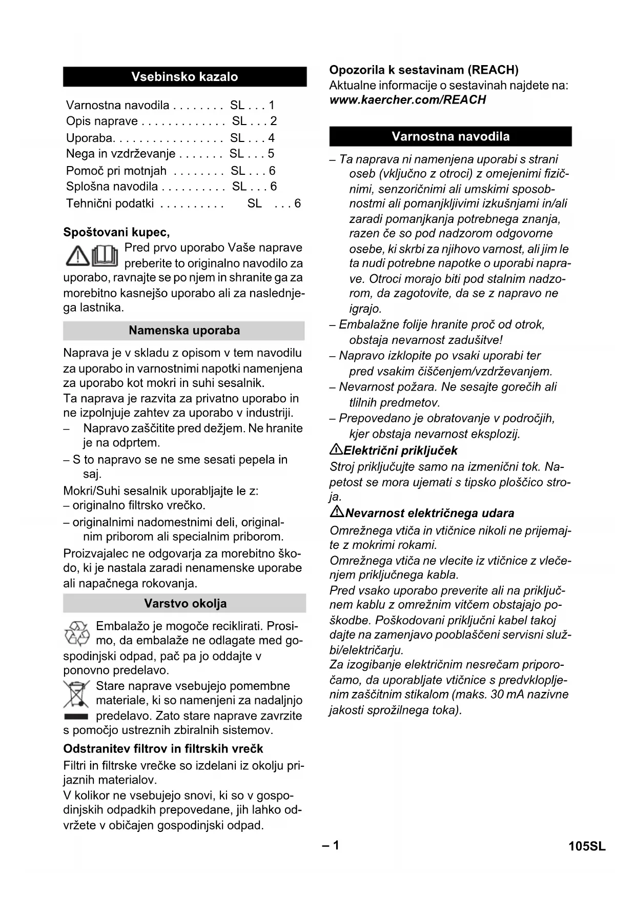 • Síťový kabel je pravděpodobně znečištěn, vyčistěte síťový kabel. Pokud je sací výkon přístroje nižší, zkontroluj- te následující body. Příslušenství, sací hadice nebo sací trub- ka jsou ucpané, ucpávku odstraňte pomo- cí tyčky. Patronový filtr je znečištěný: U přístrojů bez efektivního čištění filt- ru: Patronový filtr vyklepejte a je-li potřeba očistěte pod tekoucí vodou. (viz popis / obrázek ) U přístrojů s efektivním čištěním filtru: Použít čištění filtru. (viz popis / obrázek ) Je-li potřeba očistěte patronový filtr pod tekoucí vodou. (viz popis / obrázek ) Poškozený patronový filtr vyměňte za nový. Filtrační sáček je plný, vložte nový filtrační sáček. (viz popis / obrázek ) V každé zemi platí záruční podmínky vydané naší příslušnou distribuční společností. Even- tuální poruchy vzniklé na přístroji odstraníme během záruční doby bezplatně v případě, je-li příčinou poruchy chyba materiálu nebo výrob- ce. V případě záruky se prosím obraťte i s příslušenstvím a prodejním účtem na Vašeho obchodníka nebo na nejbližší autori- zovanou servisní službu. (Adresy poboček najdete na zadní straně) Budete-li mít otázky nebo v případě poruchy Vám naše zastoupení KÄRCHER rádo pomůže. (Adresy poboček najdete na zadní straně) Výběr nejčastěji vyžadovaných náhradních díků najdete na konci návodu k obsluze. Náhradní díly a příslušenství dostanete u Vašeho prodejce nebo na pobočce KÄRCHER. (Adresy poboček najdete na zadní straně) Technické údaje naleznete na výklopné stra- ně. Zde jsou vysvětleny použité symboly. Technické změny vyhrazeny. Pomoc při poruchách Kabelový naviják nefunguje Snížení sacího výkonu Obecná upozornění Záruka Oddělení služeb zákazníkům Objednávka náhradních dílů a zvláštního příslušenství Technické údaje Napětí Výkon P jmen Výkon P max Max. přikon přístrojové zástrčky Síťová pojistka (pomalá) Objem sběrné nádoby Nasávání vody pomocí rukojeti Nasávání vody pomocí podlahové trysky Sít'ový kabel Hladina akustického tlaku (EN 60704-2-1) Hmotnost (bez příslušenství) 104 CSSlovenšina – 1 Spoštovani kupec, Pred prvo uporabo Vaše naprave preberite to originalno navodilo za uporabo, ravnajte se po njem in shranite ga za morebitno kasnejšo uporabo ali za naslednje- ga lastnika. Naprava je v skladu z opisom v tem navodilu za uporabo in varnostnimi napotki namenjena za uporabo kot mokri in suhi sesalnik. Ta naprava je razvita za privatno uporabo in ne izpolnjuje zahtev za uporabo v industriji. – Napravo zaščitite pred dežjem. Ne hranite je na odprtem. – S to napravo se ne sme sesati pepela in saj. Mokri/Suhi sesalnik uporabljajte le z: – originalno filtrsko vrečko. – originalnimi nadomestnimi deli, original- nim priborom ali specialnim priborom. Proizvajalec ne odgovarja za morebitno ško- do, ki je nastala zaradi nenamenske uporabe ali napačnega rokovanja. Embalažo je mogoče reciklirati. Prosi- mo, da embalaže ne odlagate med go- spodinjski odpad, pač pa jo oddajte v ponovno predelavo. Stare naprave vsebujejo pomembne materiale, ki so namenjeni za nadaljnjo predelavo. Zato stare naprave zavrzite s pomočjo ustreznih zbiralnih sistemov. Filtri in filtrske vrečke so izdelani iz okolju pri- jaznih materialov. V kolikor ne vsebujejo snovi, ki so v gospo- dinjskih odpadkih prepovedane, jih lahko od- vržete v običajen gospodinjski odpad. Opozorila k sestavinam (REACH) Aktualne informacije o sestavinah najdete na: www.kaercher.com/REACH – Ta naprava ni namenjena uporabi s strani oseb (vključno z otroci) z omejenimi fizič- nimi, senzoričnimi ali umskimi sposob- nostmi ali pomanjkljivimi izkušnjami in/ali zaradi pomanjkanja potrebnega znanja, razen če so pod nadzorom odgovorne osebe, ki skrbi za njihovo varnost, ali jim le ta nudi potrebne napotke o uporabi napra- ve. Otroci morajo biti pod stalnim nadzo- rom, da zagotovite, da se z napravo ne igrajo. – Embalažne folije hranite proč od otrok, obstaja nevarnost zadušitve! – Napravo izklopite po vsaki uporabi ter pred vsakim čiščenjem/vzdrževanjem. – Nevarnost požara. Ne sesajte gorečih ali tlilnih predmetov. – Prepovedano je obratovanje v področjih, kjer obstaja nevarnost eksplozij. 몇 Električni priključek Stroj priključujte samo na izmenični tok. Na- petost se mora ujemati s tipsko ploščico stro- ja. Nevarnost električnega udara Omrežnega vtiča in vtičnice nikoli ne prijemaj- te z mokrimi rokami. Omrežnega vtiča ne vlecite iz vtičnice z vleče- njem priključnega kabla. Pred vsako uporabo preverite ali na priključ- nem kablu z omrežnim vitčem obstajajo po- škodbe. Poškodovani priključni kabel takoj dajte na zamenjavo pooblaščeni servisni služ- bi/električarju. Za izogibanje električnim nesrečam priporo- čamo, da uporabljate vtičnice s predvkloplje- nim zaščitnim stikalom (maks. 30 mA nazivne jakosti sprožilnega toka). Vsebinsko kazalo Varnostna navodila